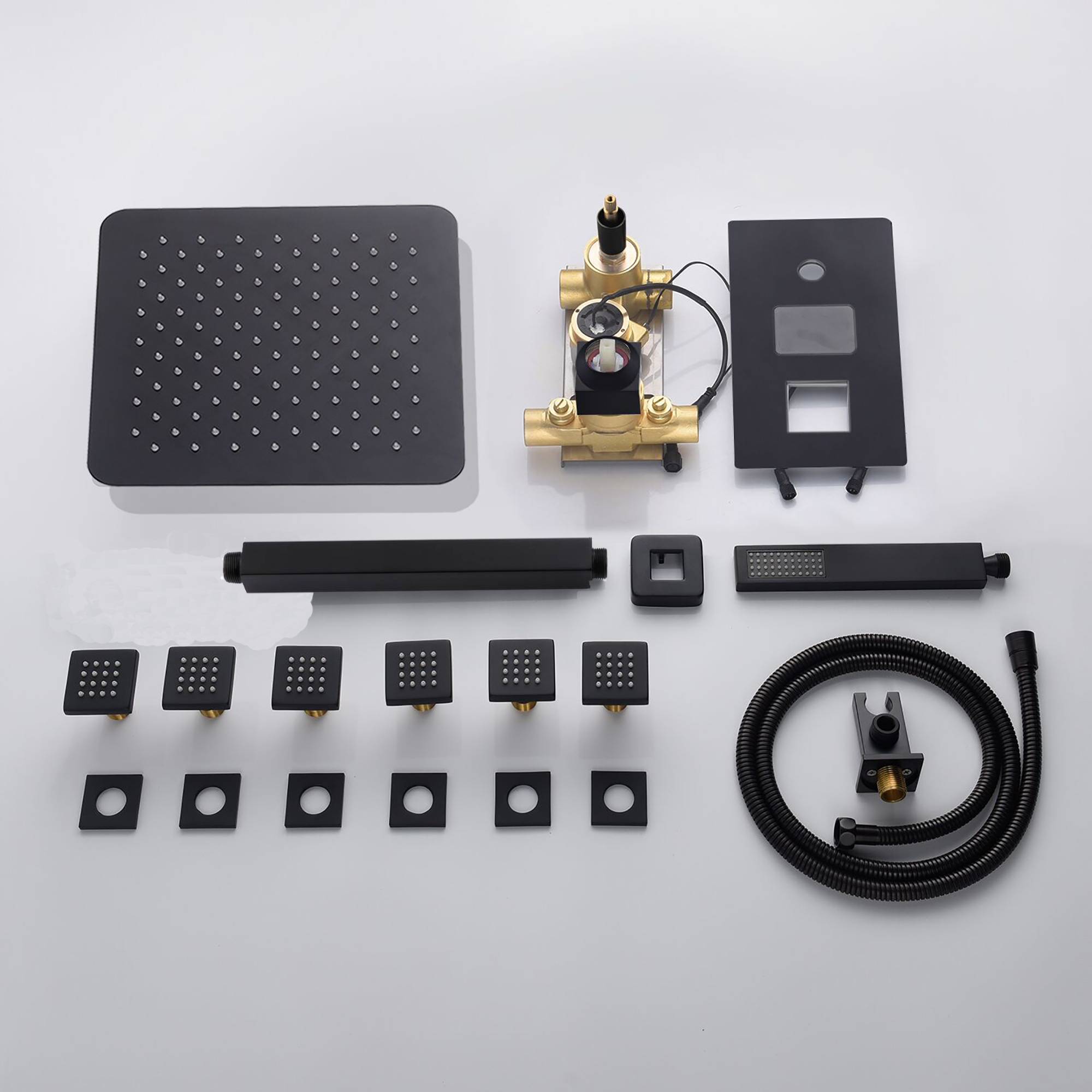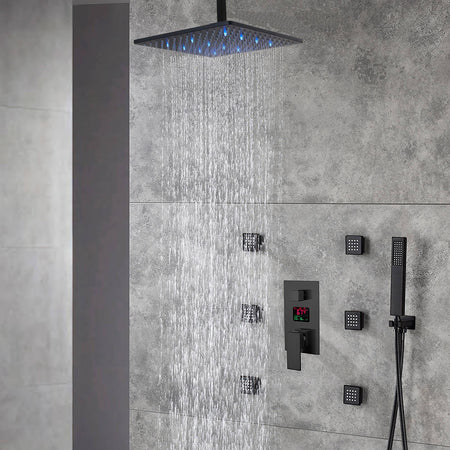 12 INCH or 16 INCH 3 LED color lights ceiling mounted 3 way matte black pressure balance Digital display rain showers with 6 body jets
