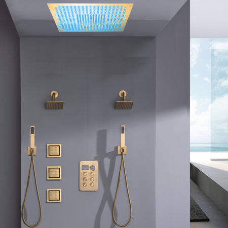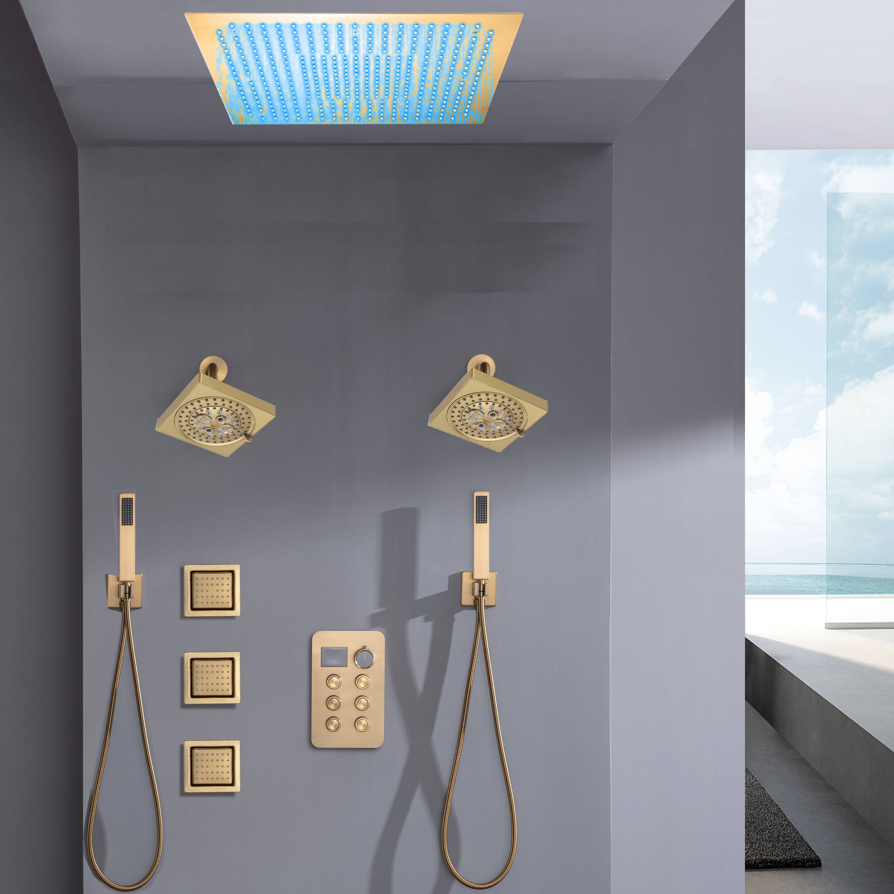 Brushed Gold or Brushed Nickel or Matte Black Flush mount 16 inch or 20 inch or 24 inch Shower Head 6 way Digital Display Shower Faucet with Dual 6'' regular head and body jets