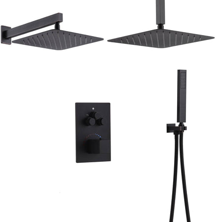 - 2x 12inch stainless shower head, 1x 9inch ceiling shower arm, 1x 16inch wall shower arm, 1x 3 way thermostatic rough in valve with trim, 1x brass shower holder, 1x brass handle sprayer, 1x stainless shower hose,1x instruction