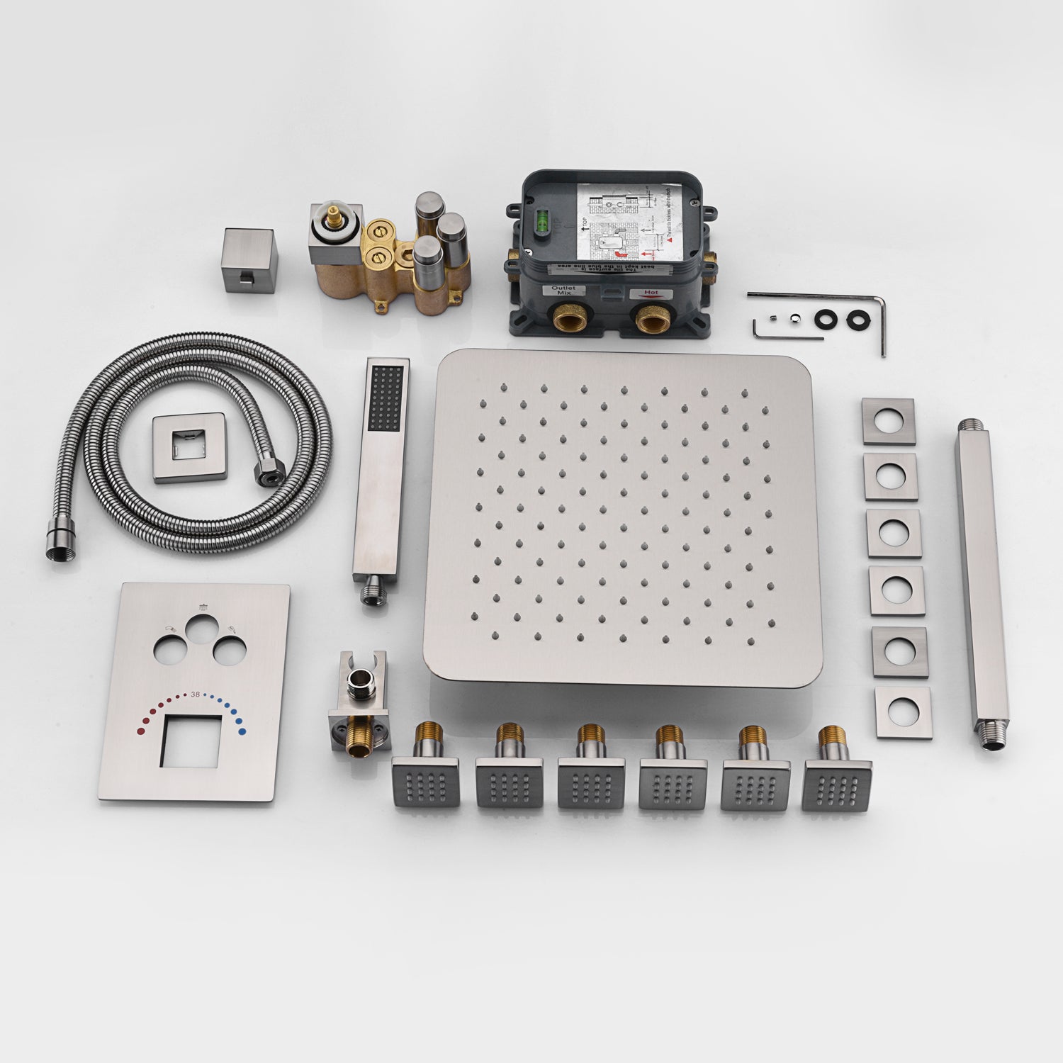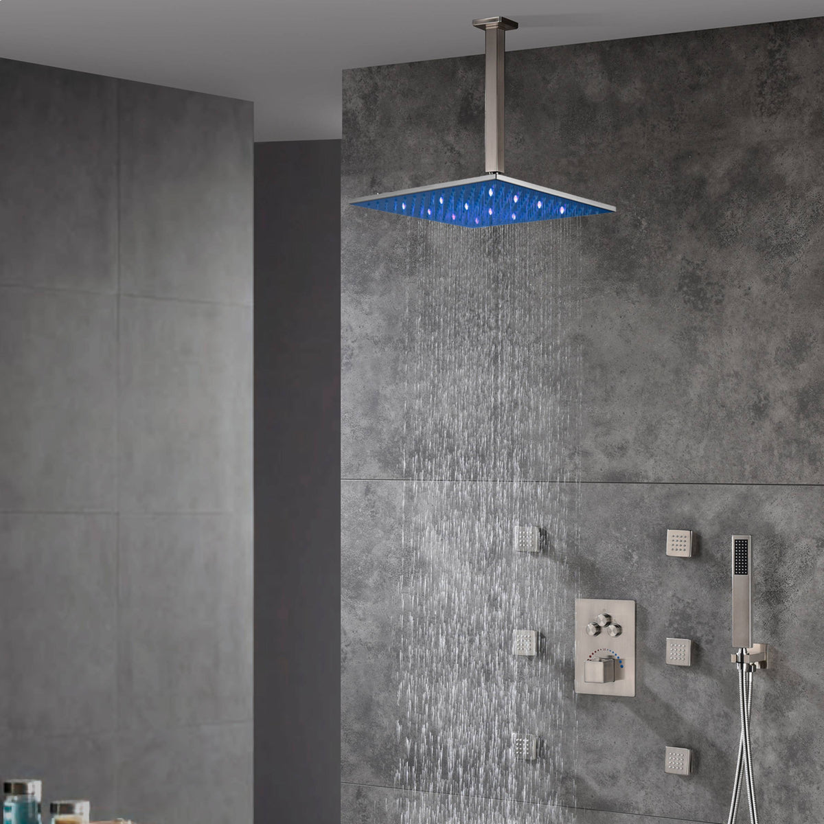 12inch or 16 inch 3 LED color lights Brushed Nickel shower systems Ceiling Mount 3 way Thermostatic valve that each function work at the same time and separately
