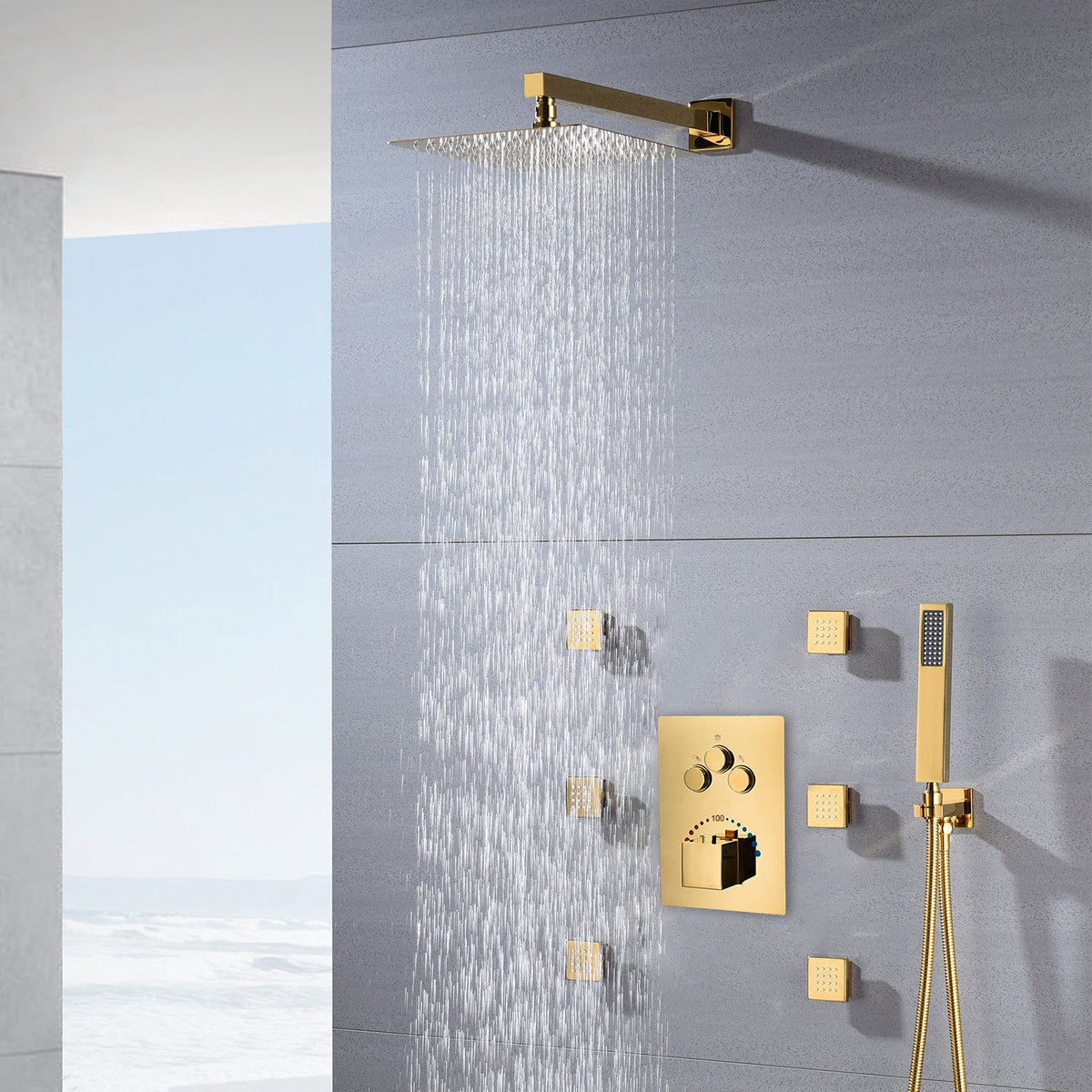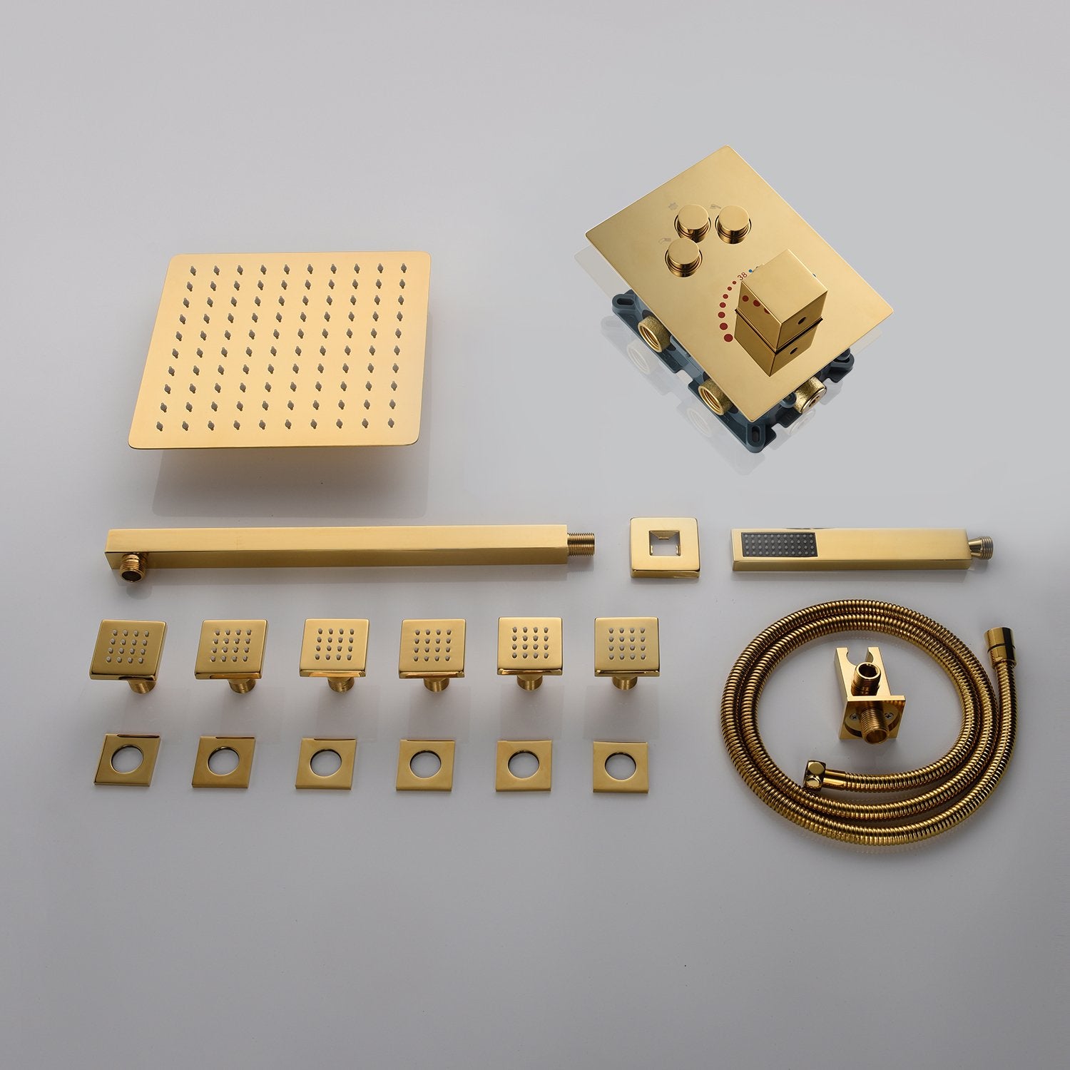 - ?High-quality Material:1X Polished Gold fixed shower head, 1X a brass handheld holder, 1X 16” brass wall shower arm,1X 59” shower hose,1X 3 way thermostatic valve mixer,1X 6pcs brass 2 inch body jets,1X brass shower holder