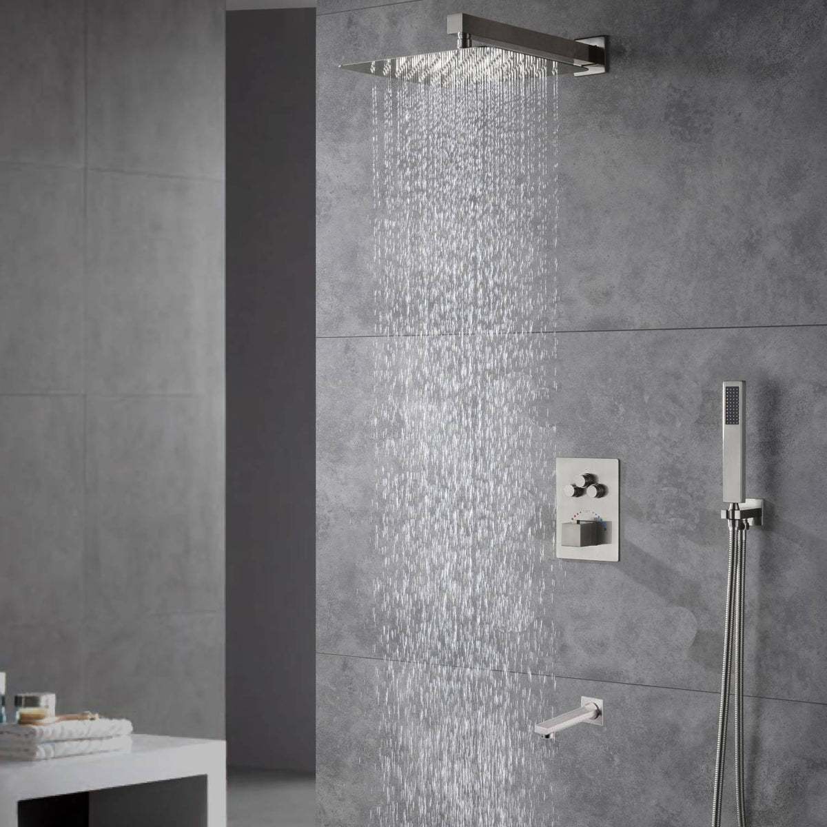 Wall mount 12 inch wall mounted 3 functions Thermostatic Mixer System Brushed Nickel rain Shower Faucet Set Tub Spout Bath
