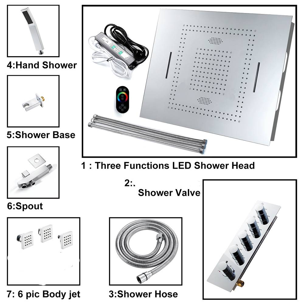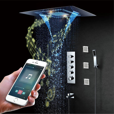 16'' Chrome Flushed in Bluetooth Music Waterfall Rainfall LED Shower Valve Ceiling Thermostatic Shower Faucet Set with 4 Inch Body Jet