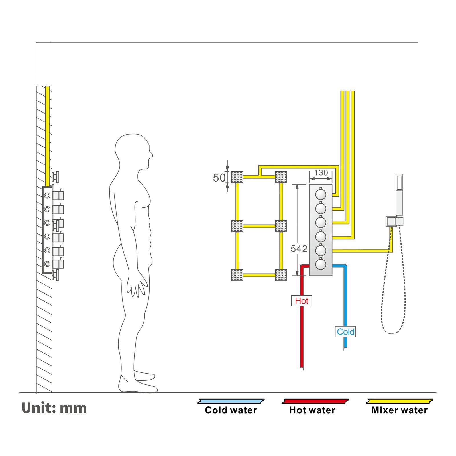 Connection: 3/4 inch hot and cold water pipeline, 1/2 inch water pipelines for other parts.