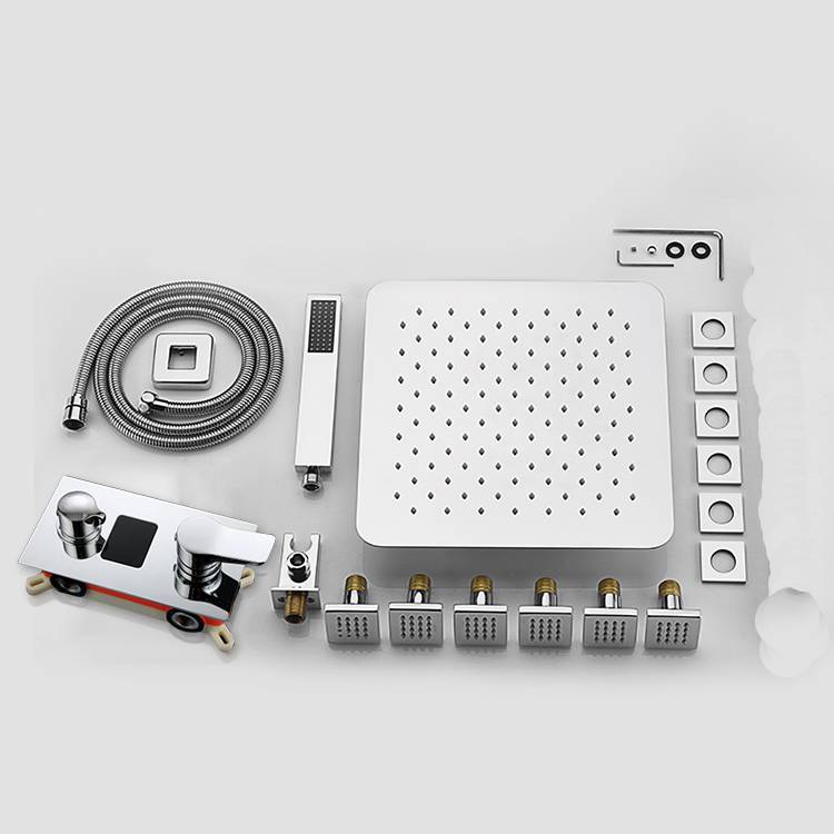 - Includes rain shower head, ceiling mount shower arm, 6 body sprays, brass hand shower parts and 3-function digital display shower valve.