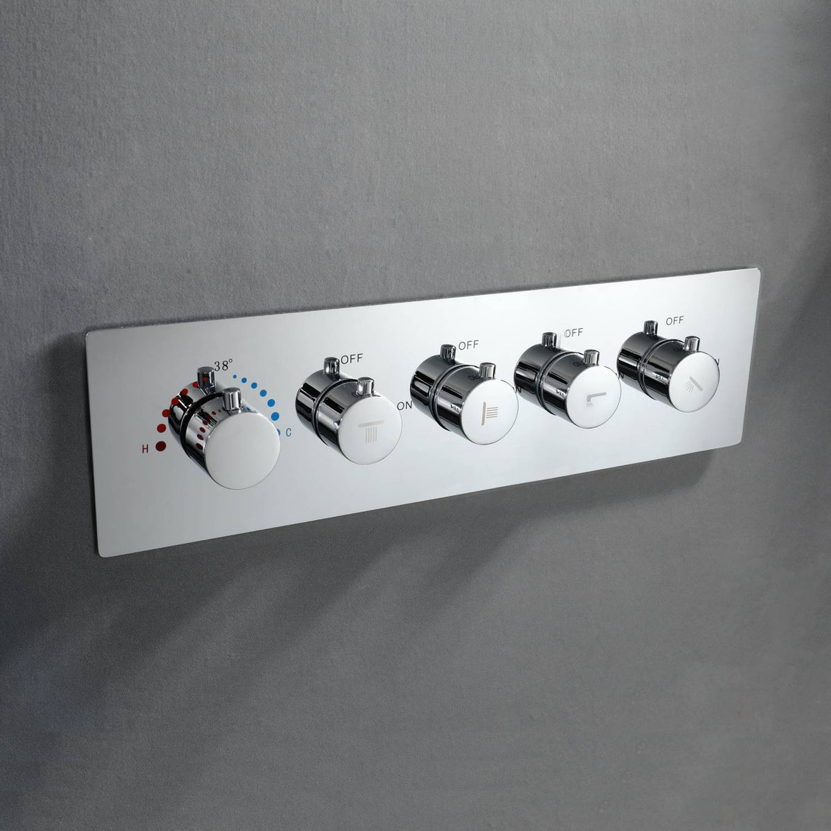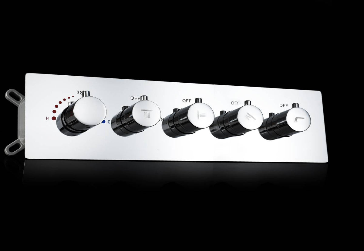 Brass handheld shower, 59inch shower hose,4 function brass thermostatic valve that each functions work at the same time and separately. 3pcs big brass body jets.