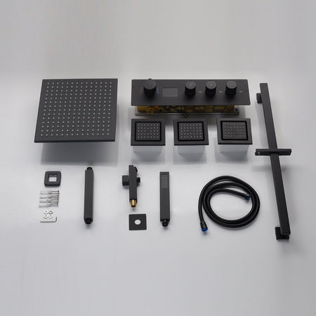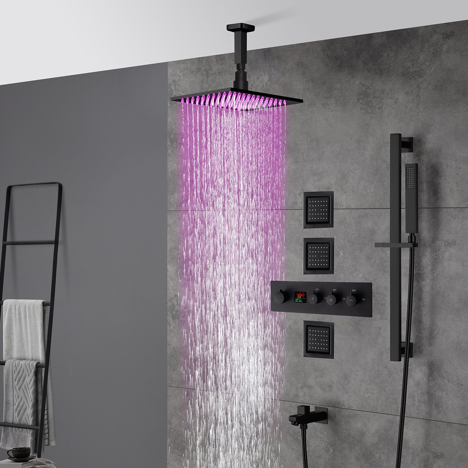 16inch LED matt black 3 way digital thermostatic shower faucet with sliding bar and 4inch body jets