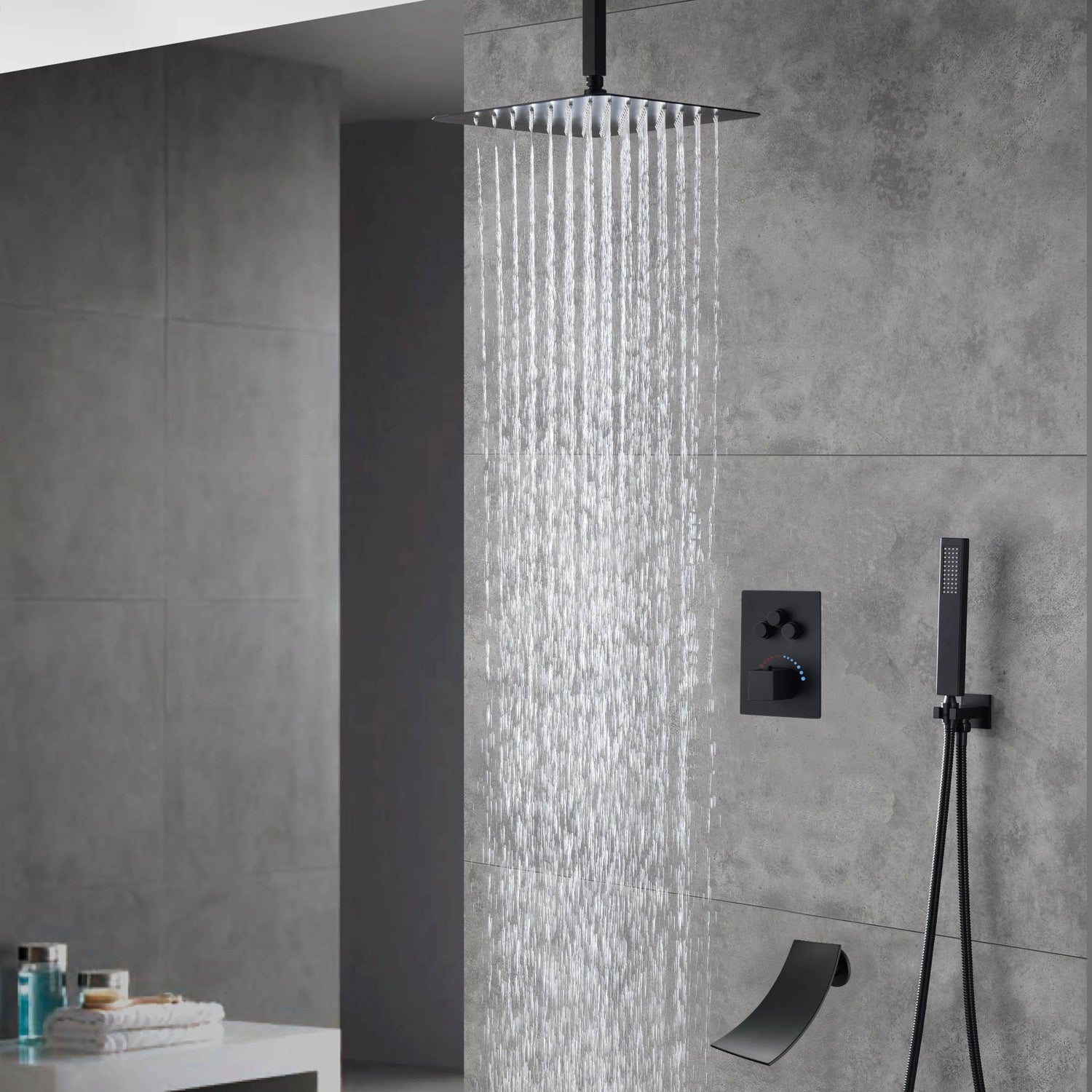 Ceiling mount 12 inch or 16 inch matte Black Rain Shower Head 3 way thermostatic shower faucet with waterfall Tub spout
