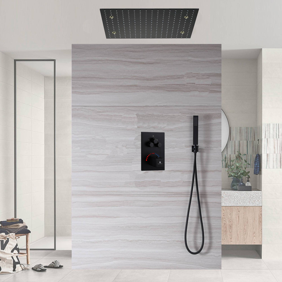 - ?High-quality Material: 1x 20'' Matte Black LED Mist shower head, 1 x a brass handheld holder, 4 x 10” shower arms, 1 x 59” shower hose, 1 x 3 way thermostatic valve mixer,1 x brass handheld shower