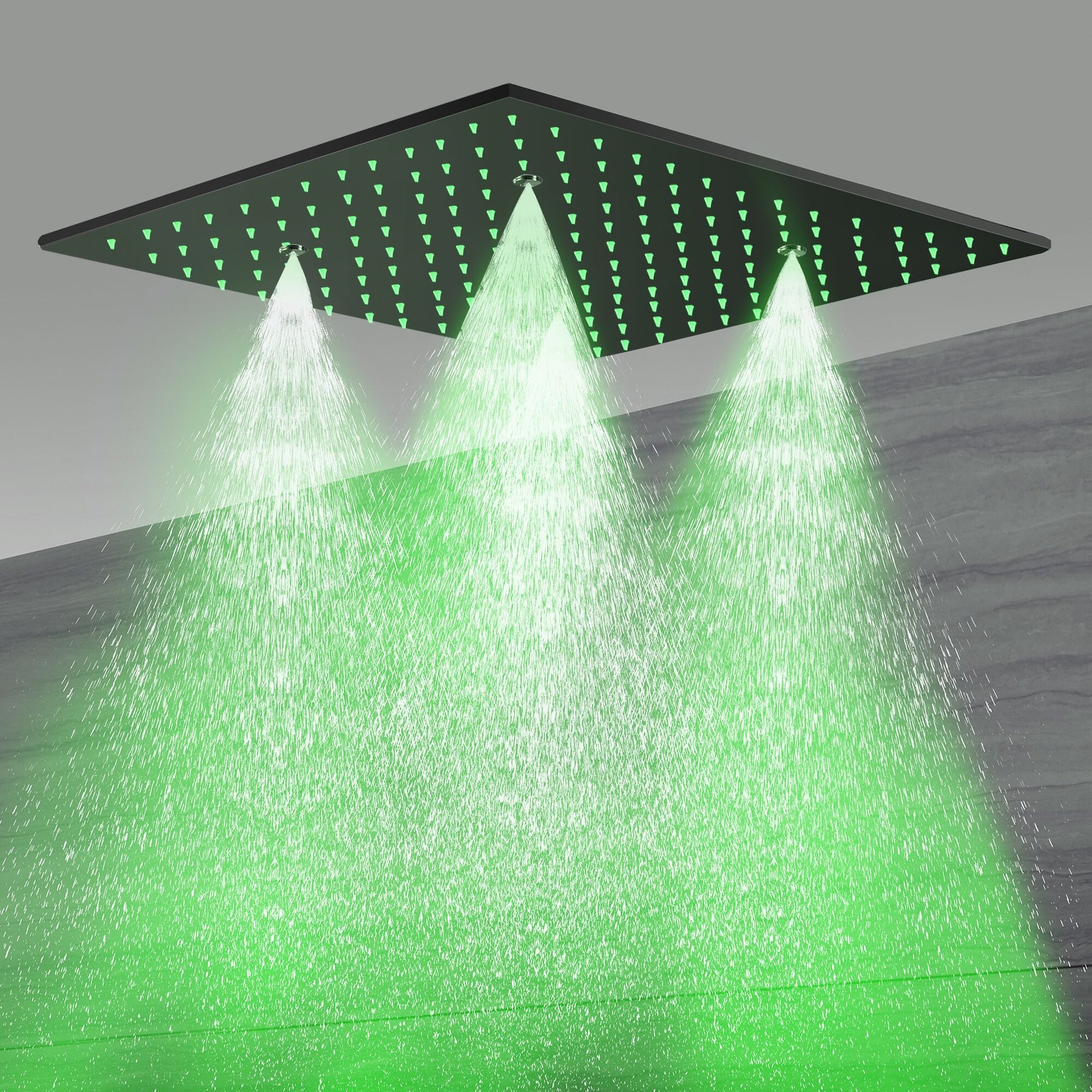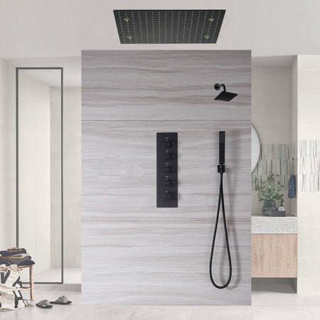 Matte black 20 inch mist rainfall LED shower head system 4 way thermostatic shower faucet with wall mount 6 inch high water pressure regular shower head