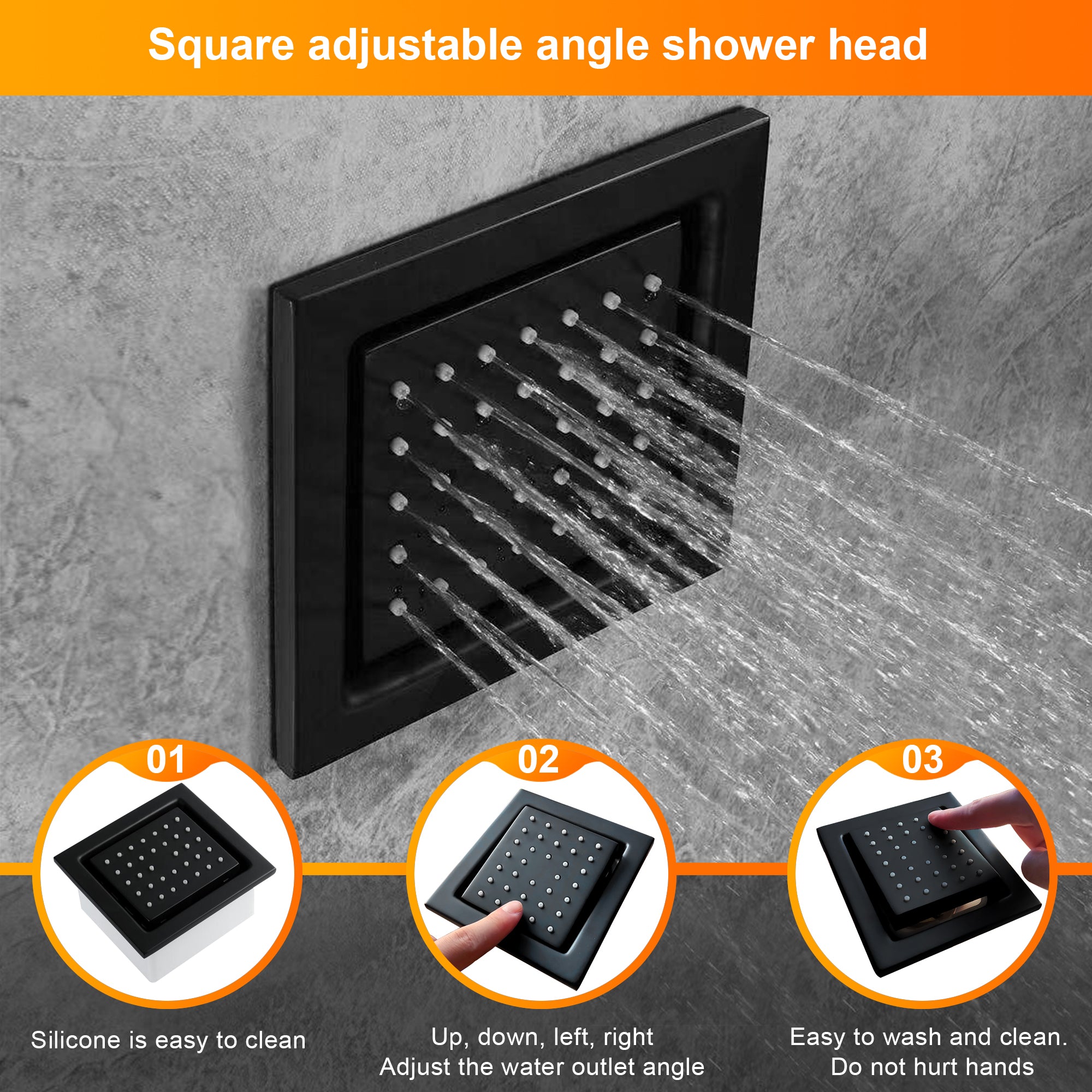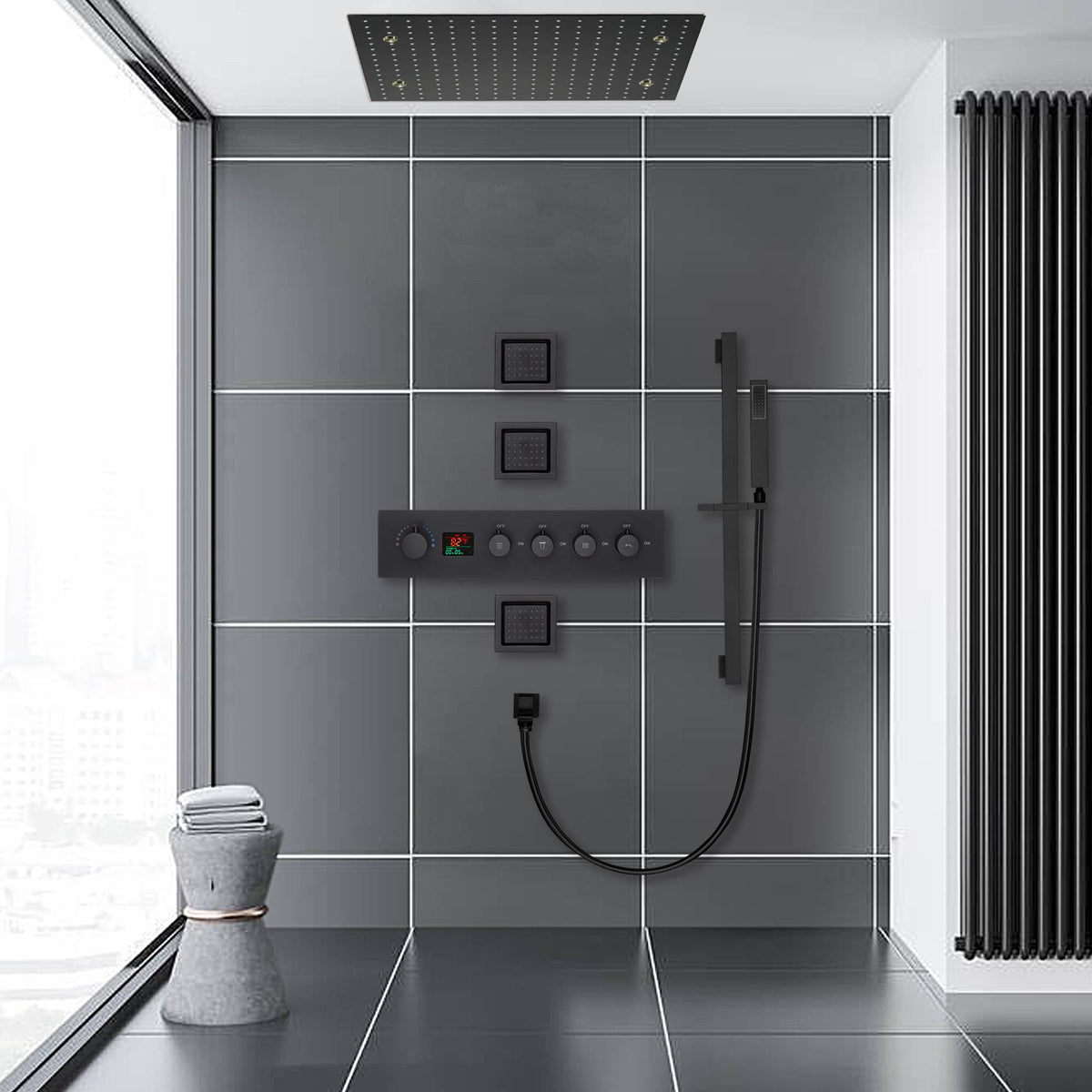 ◆High-quality Material:1X Matte Black 20'' fixed shower head, 1X a brass handheld holder, 1X wall mount” shower arm,1X 59” shower hose,1X 4 way thermostatic valve mixer,3 x brass 4 inch body jets,1X metal sliding bar