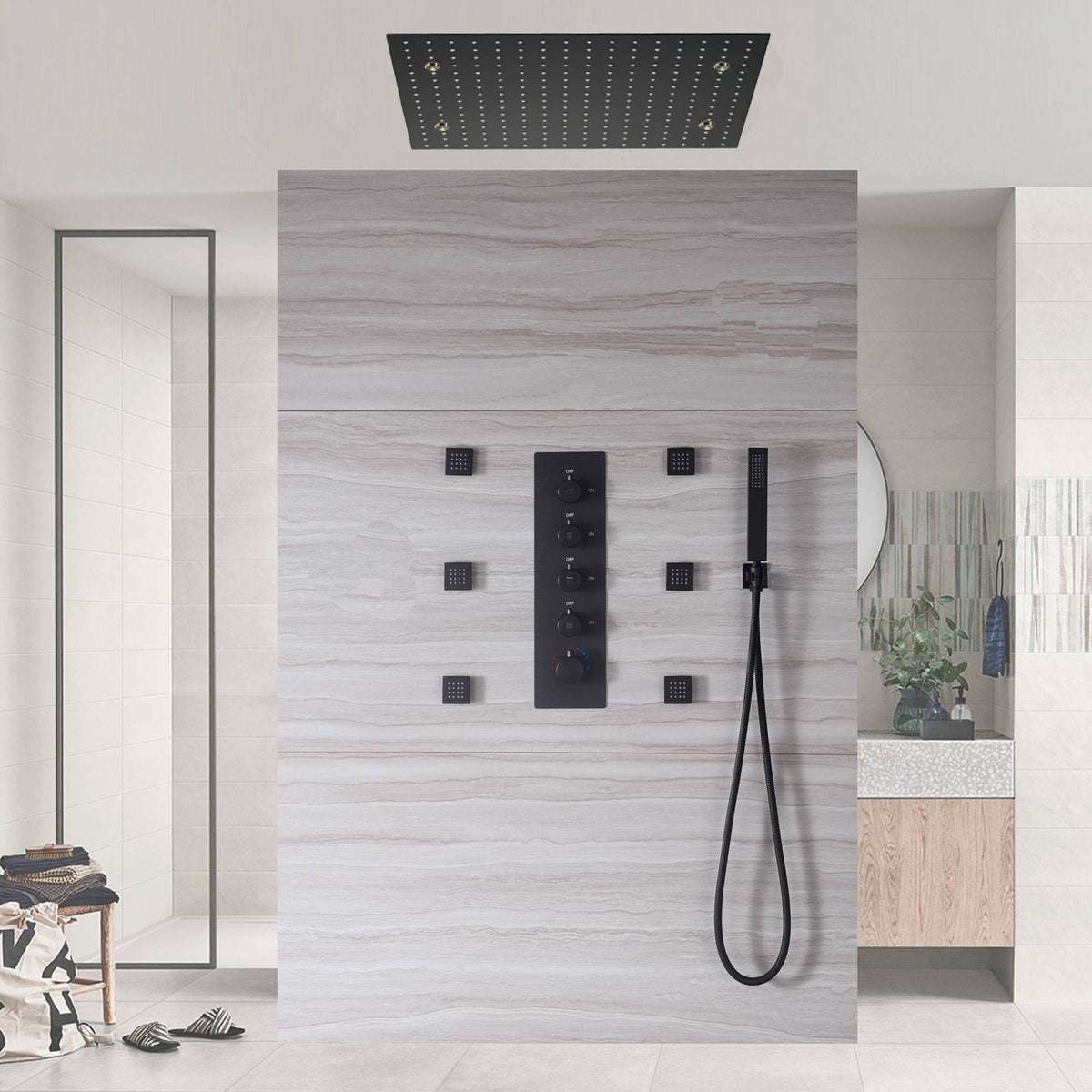 ◆High-quality Material:1X Matte Black 20'' fixed shower head, 1X a brass handheld holder, 1X wall mount” shower arm,1X 59” shower hose,1X 4 way thermostatic valve mixer,1X 6 pcs brass 2 inch body jets,1X brass shower holder,