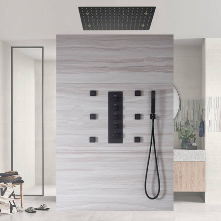 20 inch rainfall mist LED matte black rainfall shower system 4 way thermostatic rough in valve with body jets and 8inch wall mount shower head