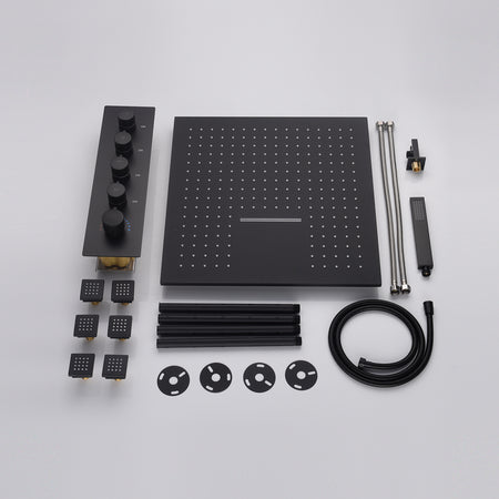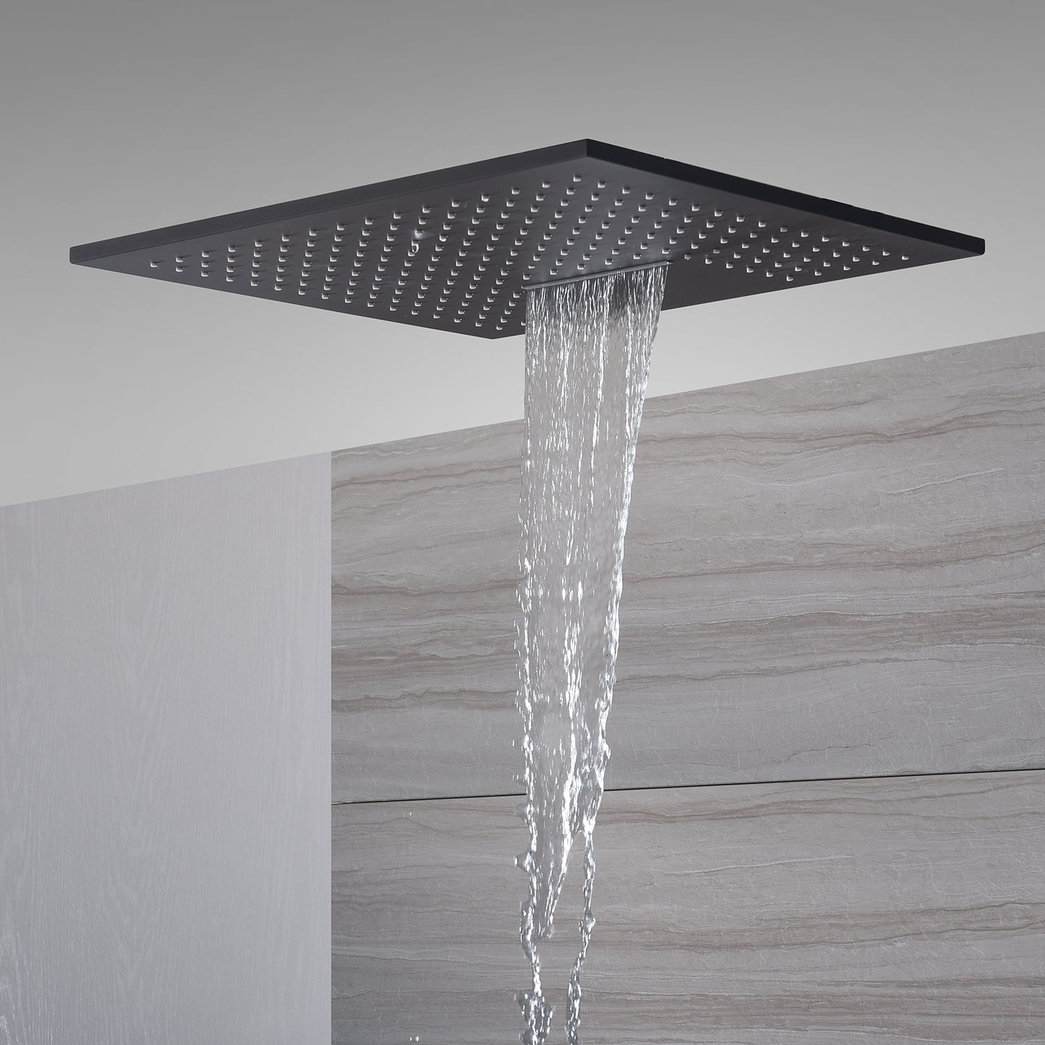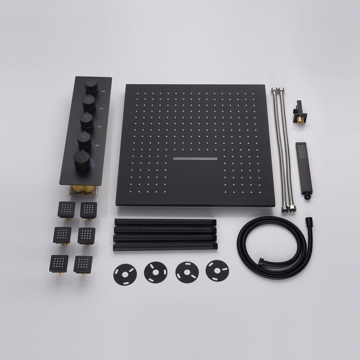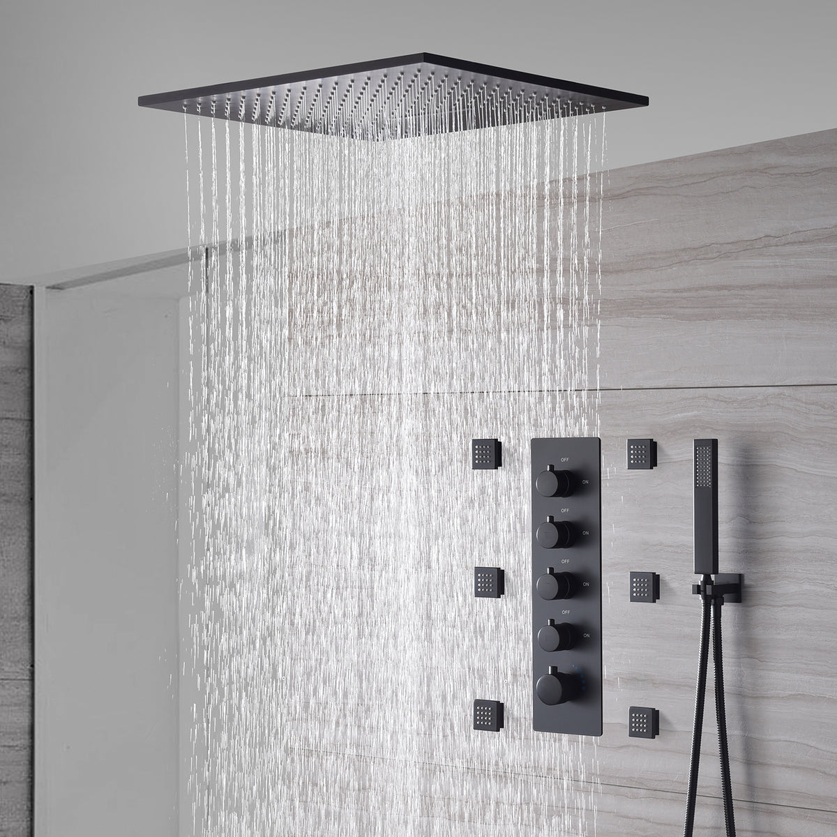 20inch matte black ceiling mount rainfall waterfall shower systems 4 way thermostatic valve with 6 body jets