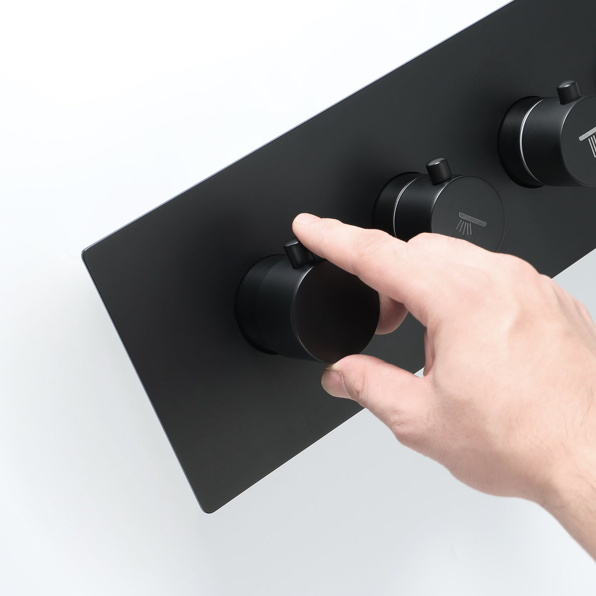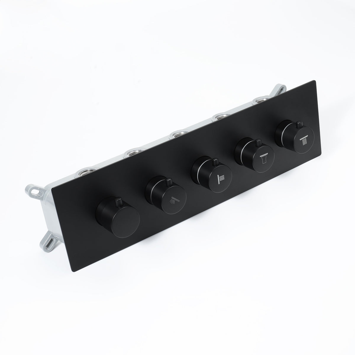 - ?High-quality Material:1X Matt Black 20'' fixed shower head, 1X a brass handheld holder, 1X 16''wall mount” shower arm,1X 59” shower hose,1X 4 way thermostatic valve mixer,1X 3pcs brass 2 inch body jets,1X brass shower holder,1 x 8inch shower head