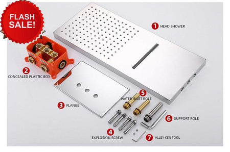 Each unit includes: 1 x 22inch shower head, 1 x 3 way rough in valve with trim, 1 x brass handle sprayer, 1 x brass shower holder, 1 x valve for shower head, 1 x stainless steel shower hose, 1 x instruction