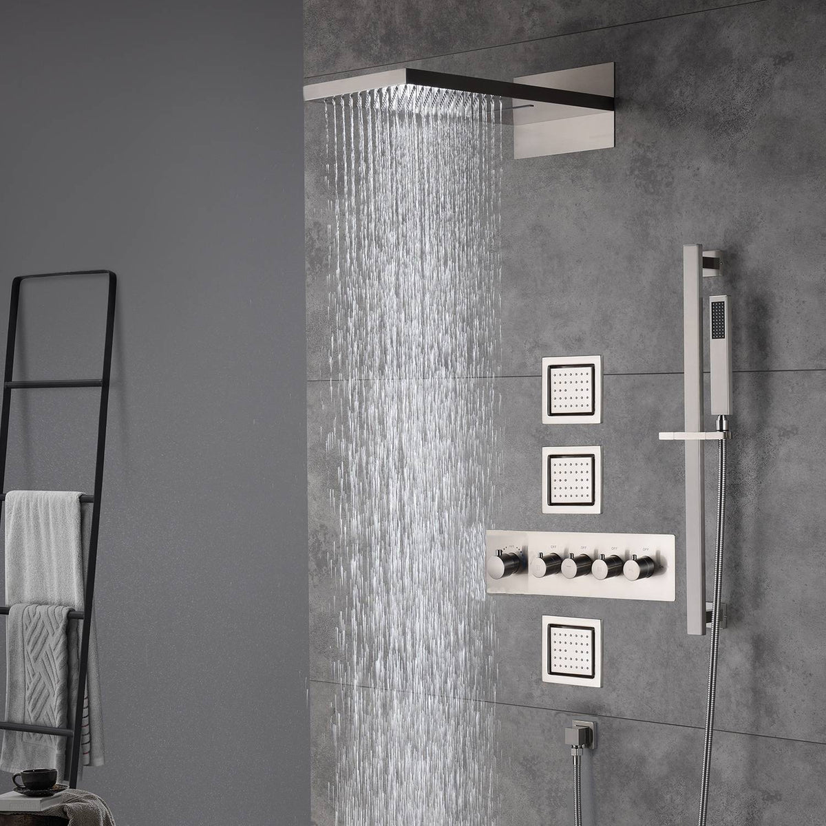 1x 22inch shower head rainfall and waterfall, 1x 4 way high flow thermostatic rough in valve with trim, 1 x brass shower holder, 1x Sliding bar,1x stainless shower hose, 3 x 4inch body jets, 1 x instruction