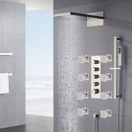 22inch rainfall and waterfall Brushed Nickel 4 Way Thermostatic Shower Faucet with 8 on/off function Body Jets