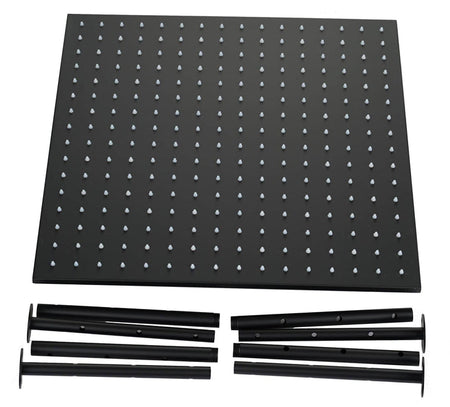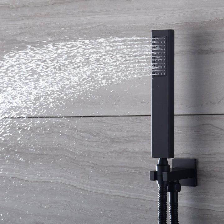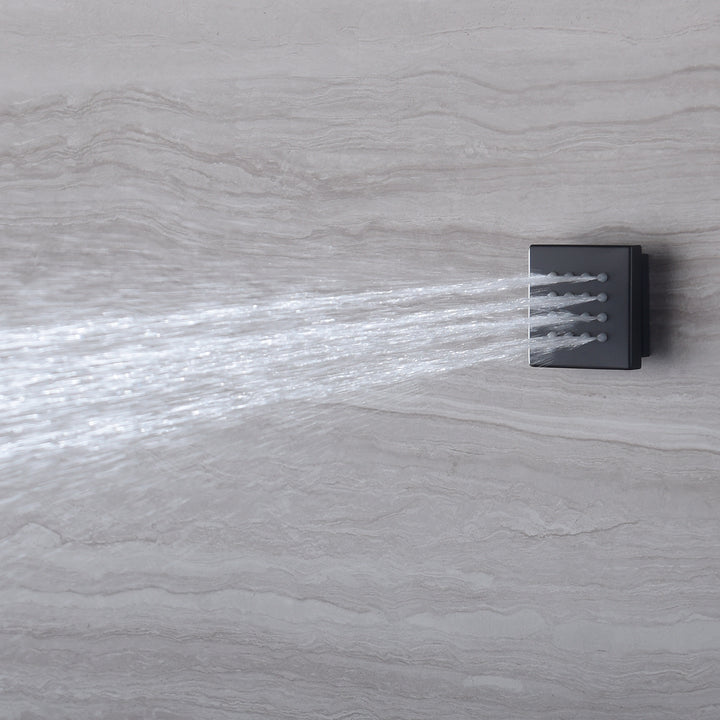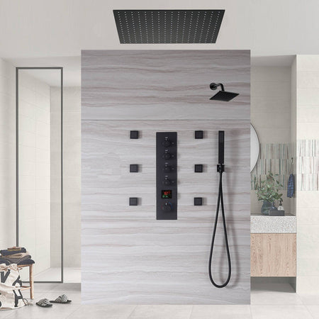 24 inch or 20 inch matte black rainfall shower system 4 way thermostatic rough in valve with body jets and 6 inch wall mount shower head