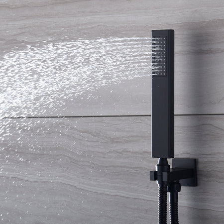 ◆High-quality Material:1X Matte Black 24'' or 20'' fixed shower head, 1X a brass handheld holder, 1X wall mount” shower arm,1X 59” shower hose,1X 4 way thermostatic valve mixer,1X 6 pcs brass 2 inch body jets,1X brass shower holder,1 x 6 inch shower head