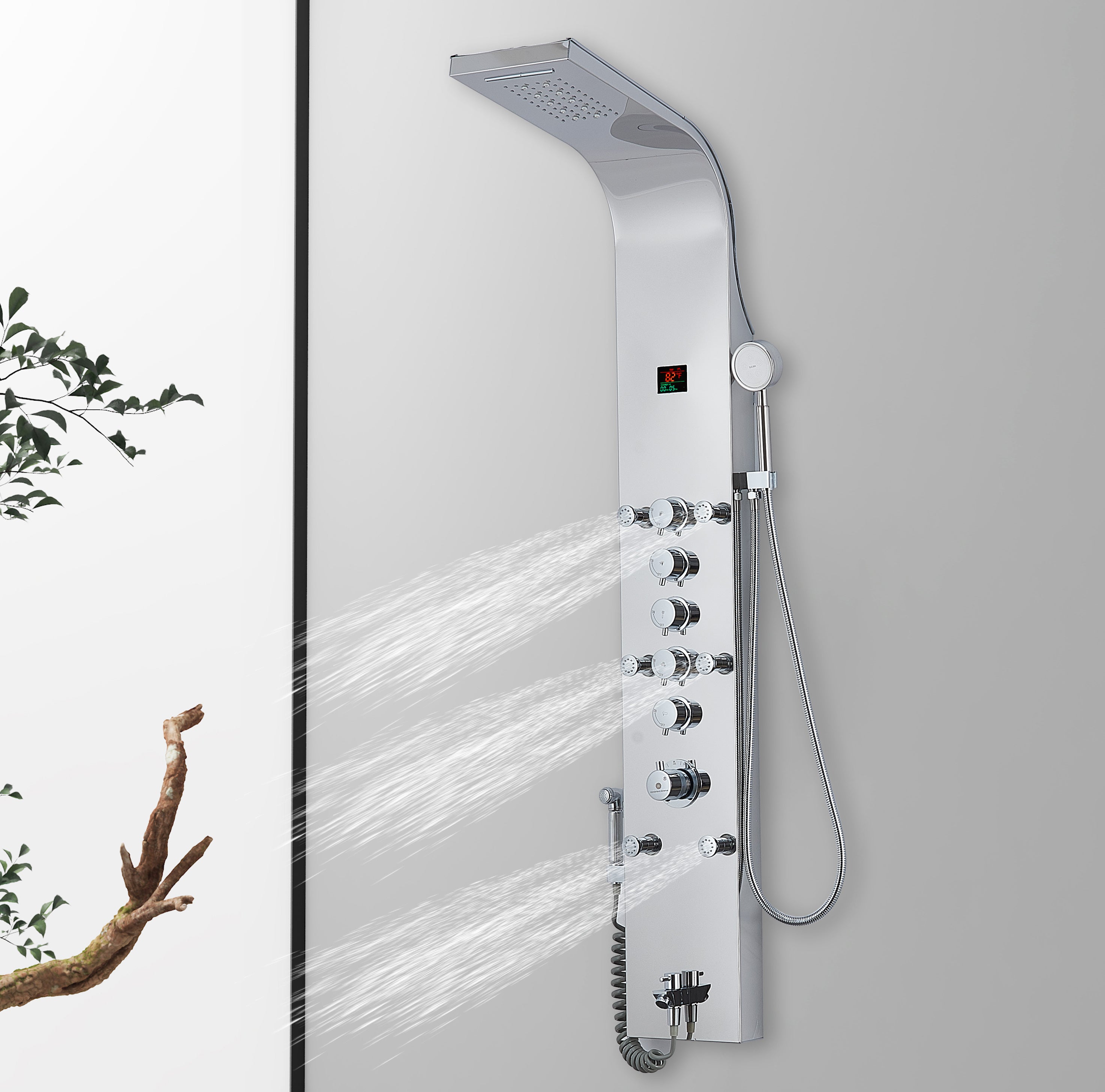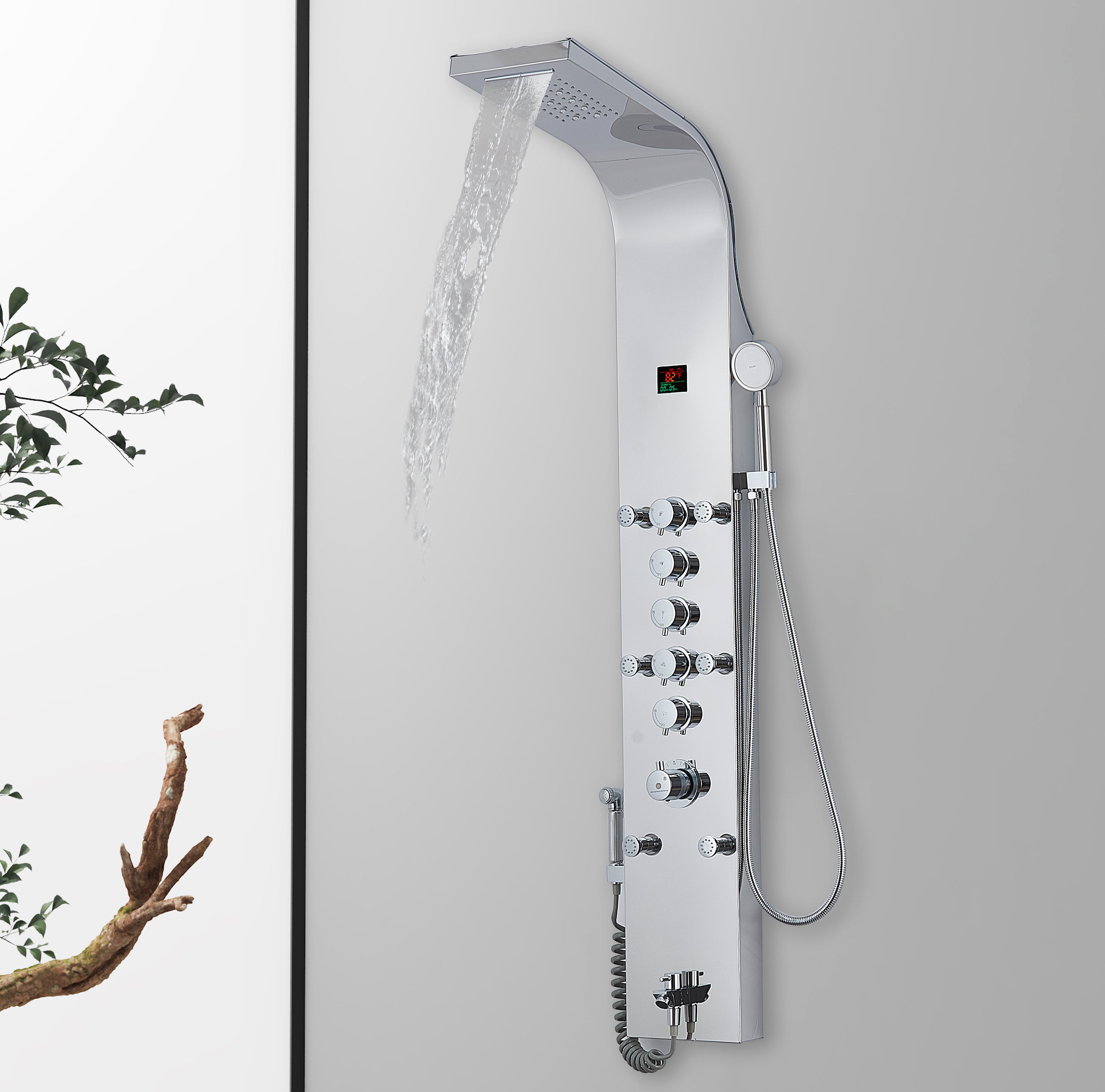 - Shower panel system comes with bulit-in 2-in-1 overhead rainfall and waterfall shower head,body massage jets and high efficiency spray handheld.