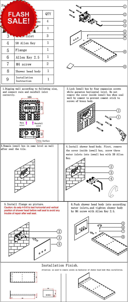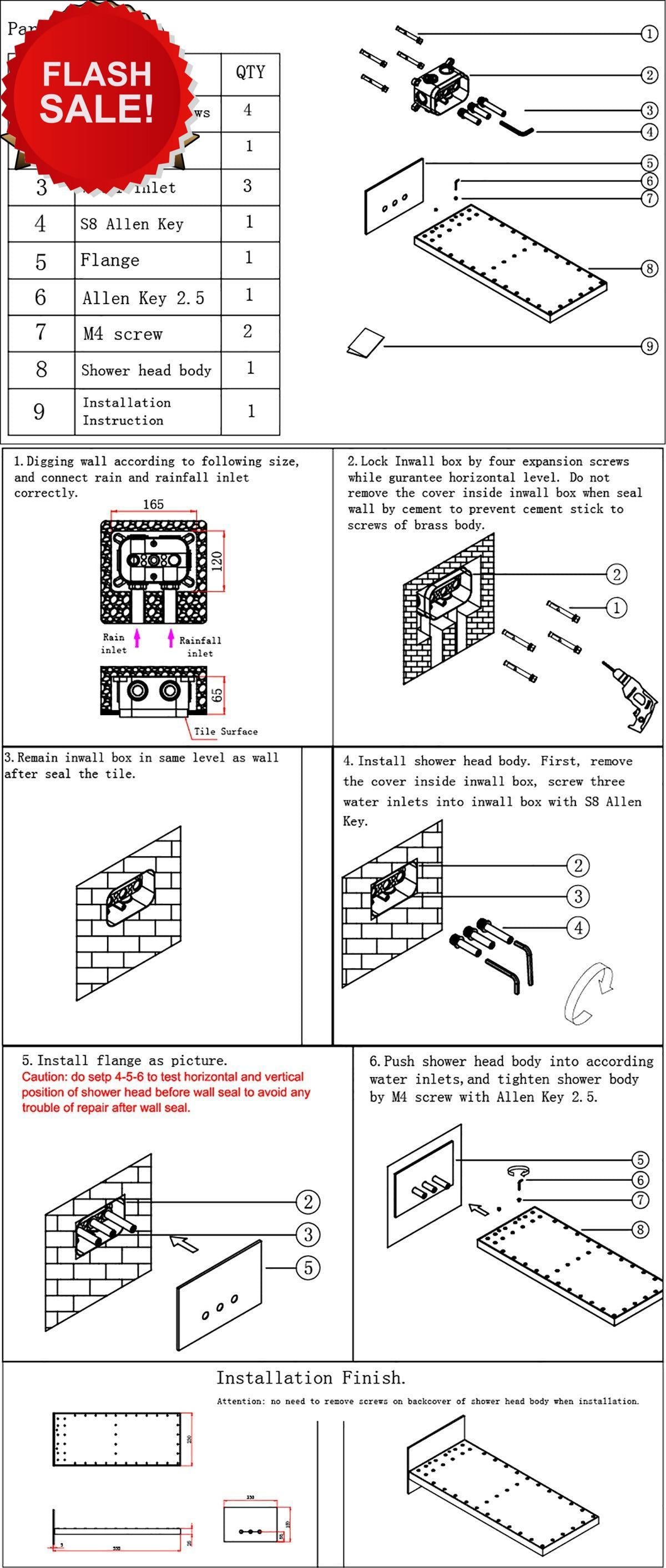 Each unit includes: 1 x 22inch shower head, 1 x 4 way rough in valve with trim, 3 x 4'' body jets, 1 x brass handle sprayer, 1 x brass shower holder, 1 x rough in valve for shower head, 1 x stainless steel shower hose, 1 x instruction
