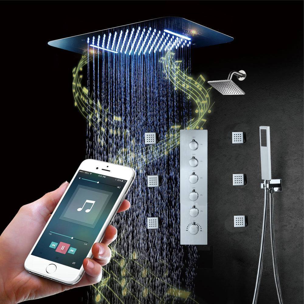 64 LED colors Brushed nickel music led flushed in 23x15inch shower head 5 way thermostatic valve that each function run at the same time and separately
