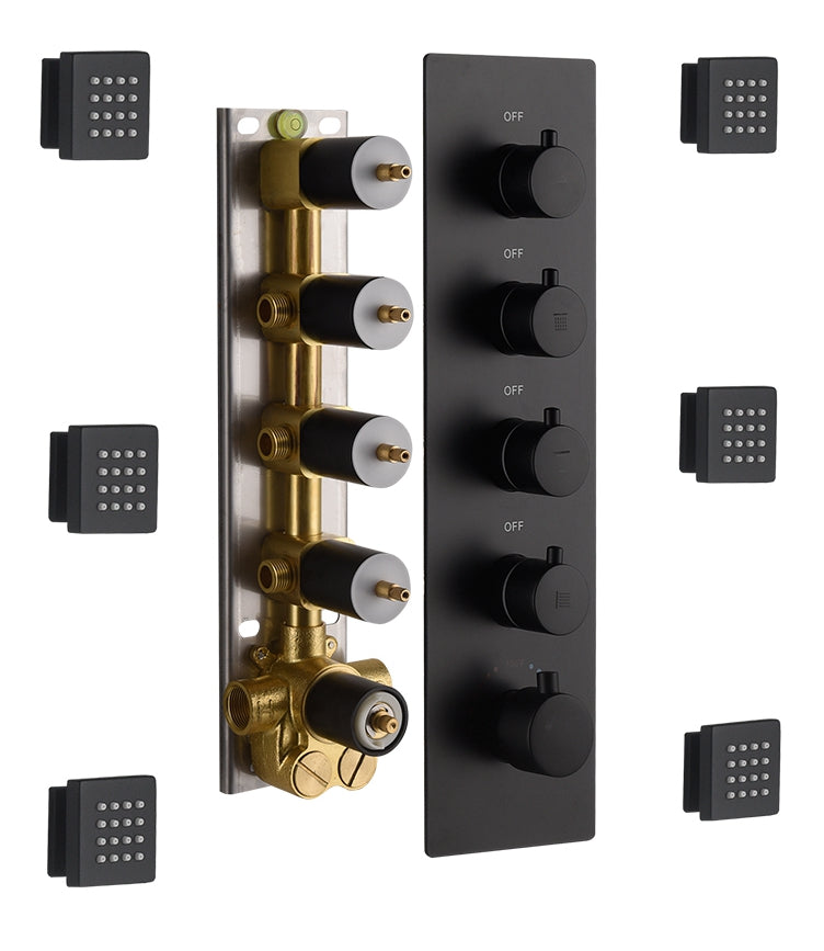 ◆High-quality Material:1X Matte Black 24'' or 20'' fixed shower head, 1X a brass handheld holder, 1X wall mount” shower arm,1X 59” shower hose,1X 4 way thermostatic valve mixer,1X 6 pcs brass 2 inch body jets,1X brass shower holder,1 x 8inch shower head
