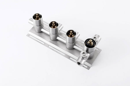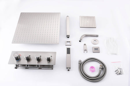 - The system includes 12" or 16'' rain shower head, a high pressure 6" shower head, a brass handheld sprayer, 9” shower arm, 59” shower hose, 3 Way thermostatic valve mixer. Reliable craftsmanship and material - each piece of this product was made with solid materials, including brass and high grade stainless steel.