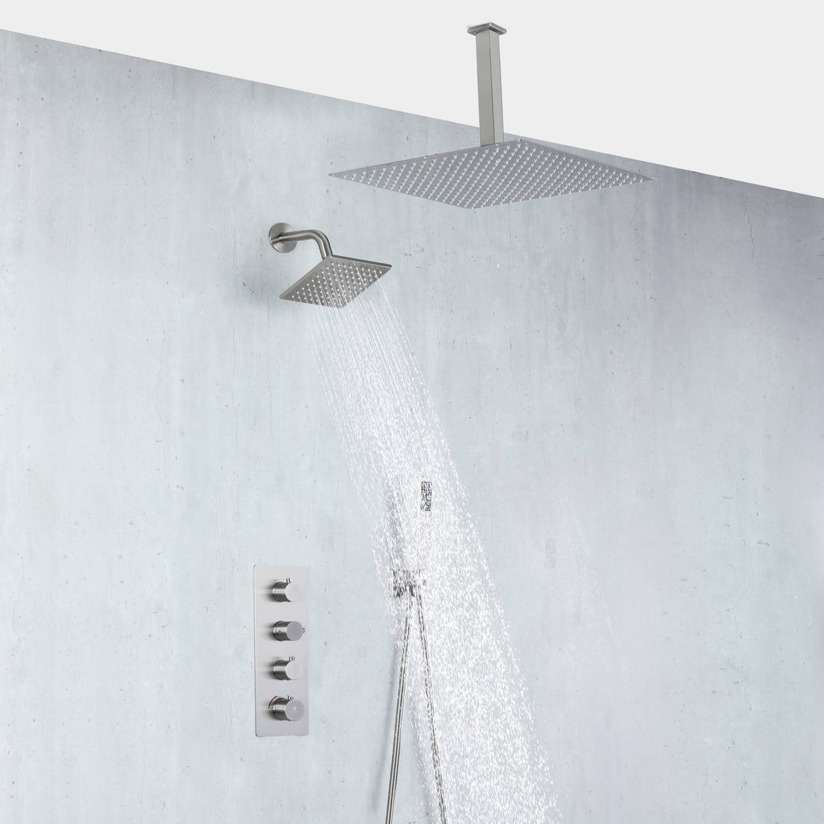 Brushed nickel Ceiling 12 Inch or 16 inch Rainfall Shower Head Wall Mount 6 Inch Regular High Water Pressure Shower Head 3 Way Thermostatic Shower Faucet Each Function Work All Together And Separately