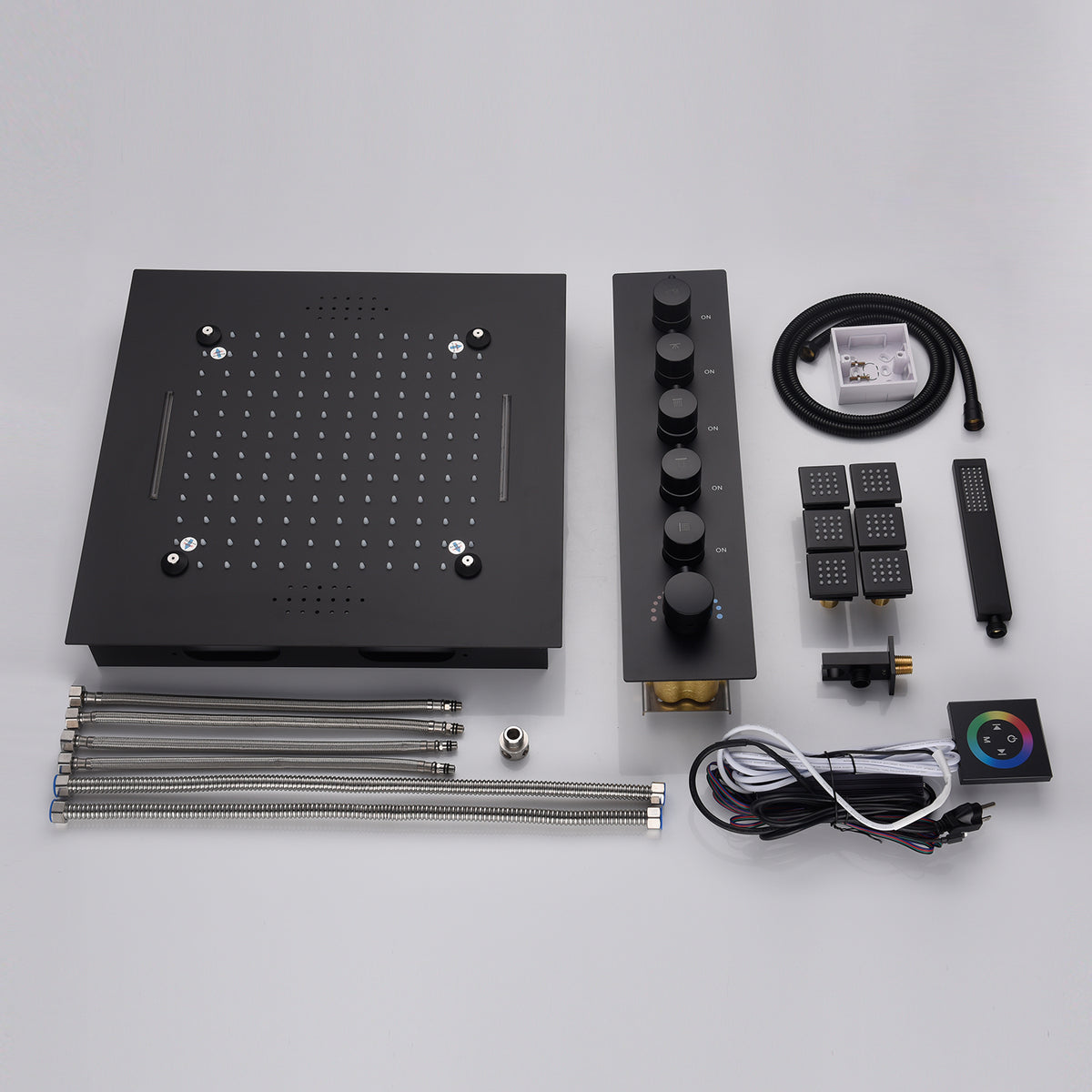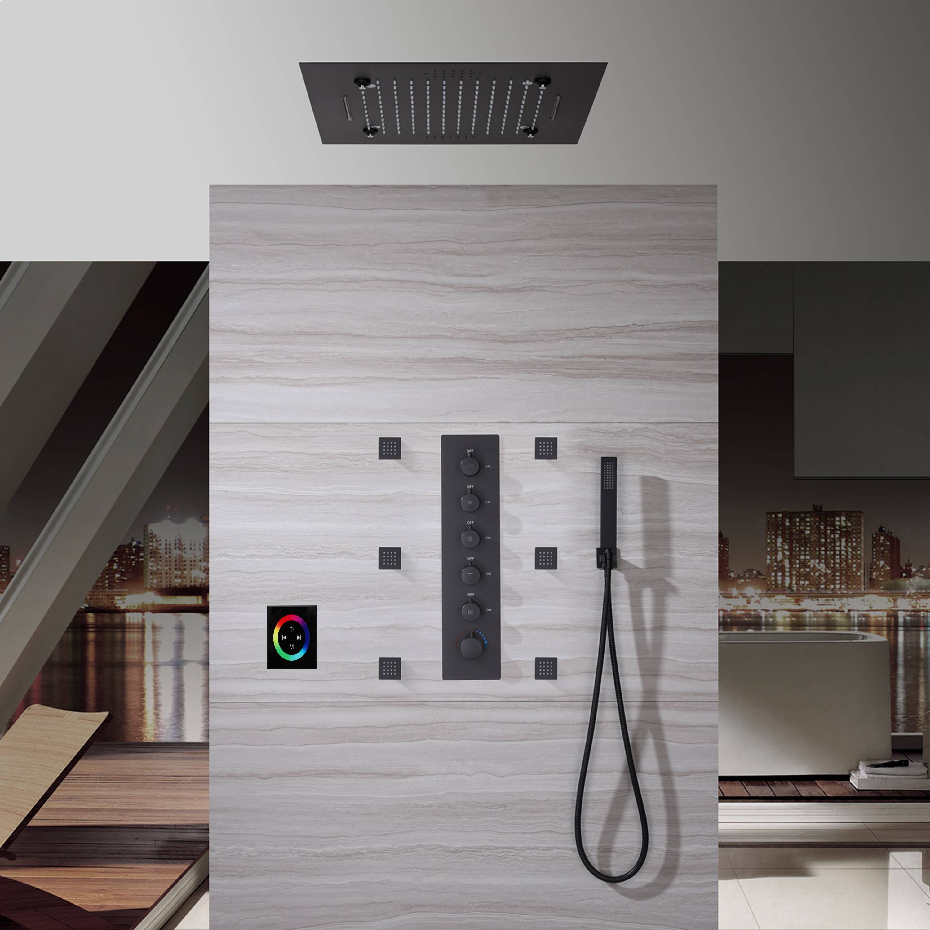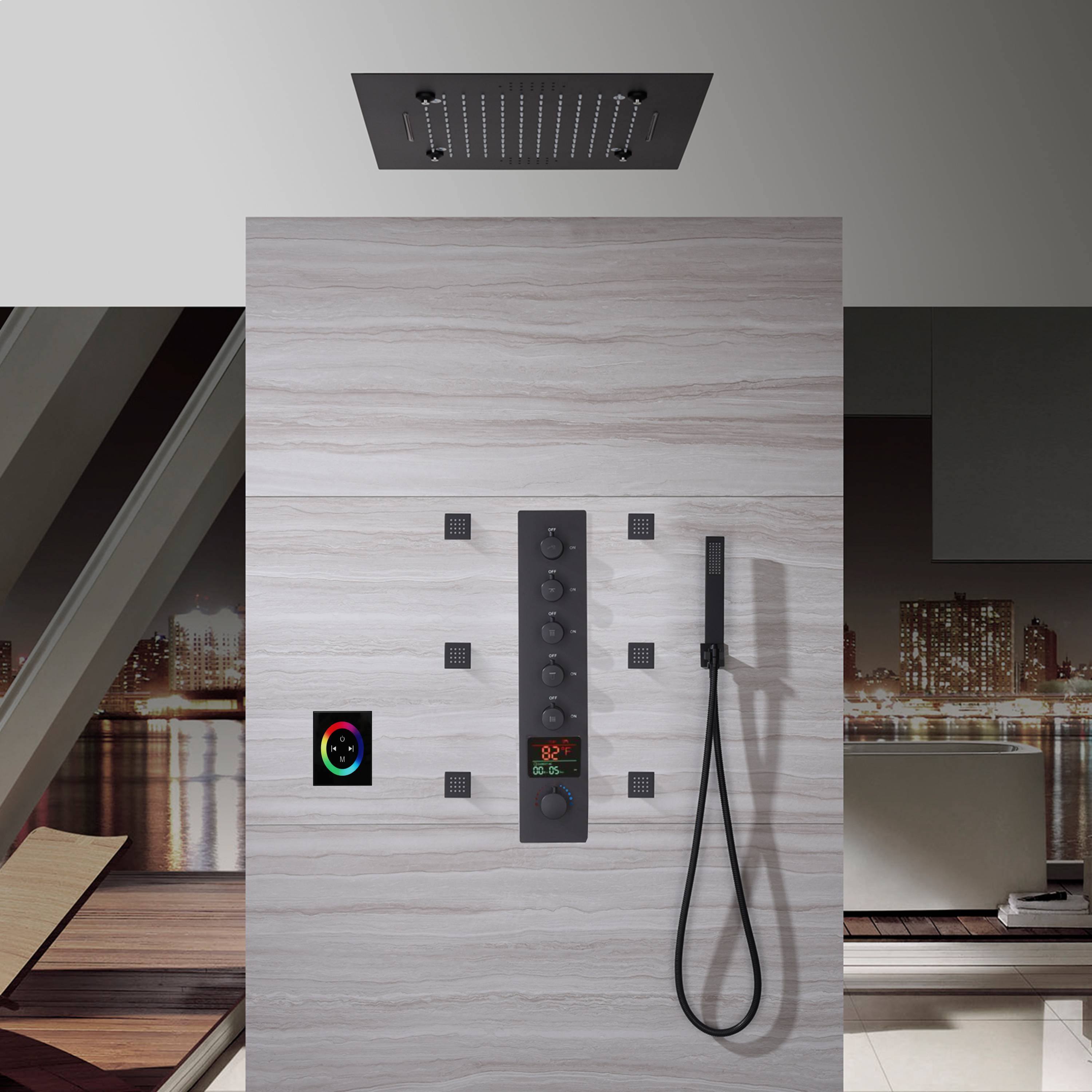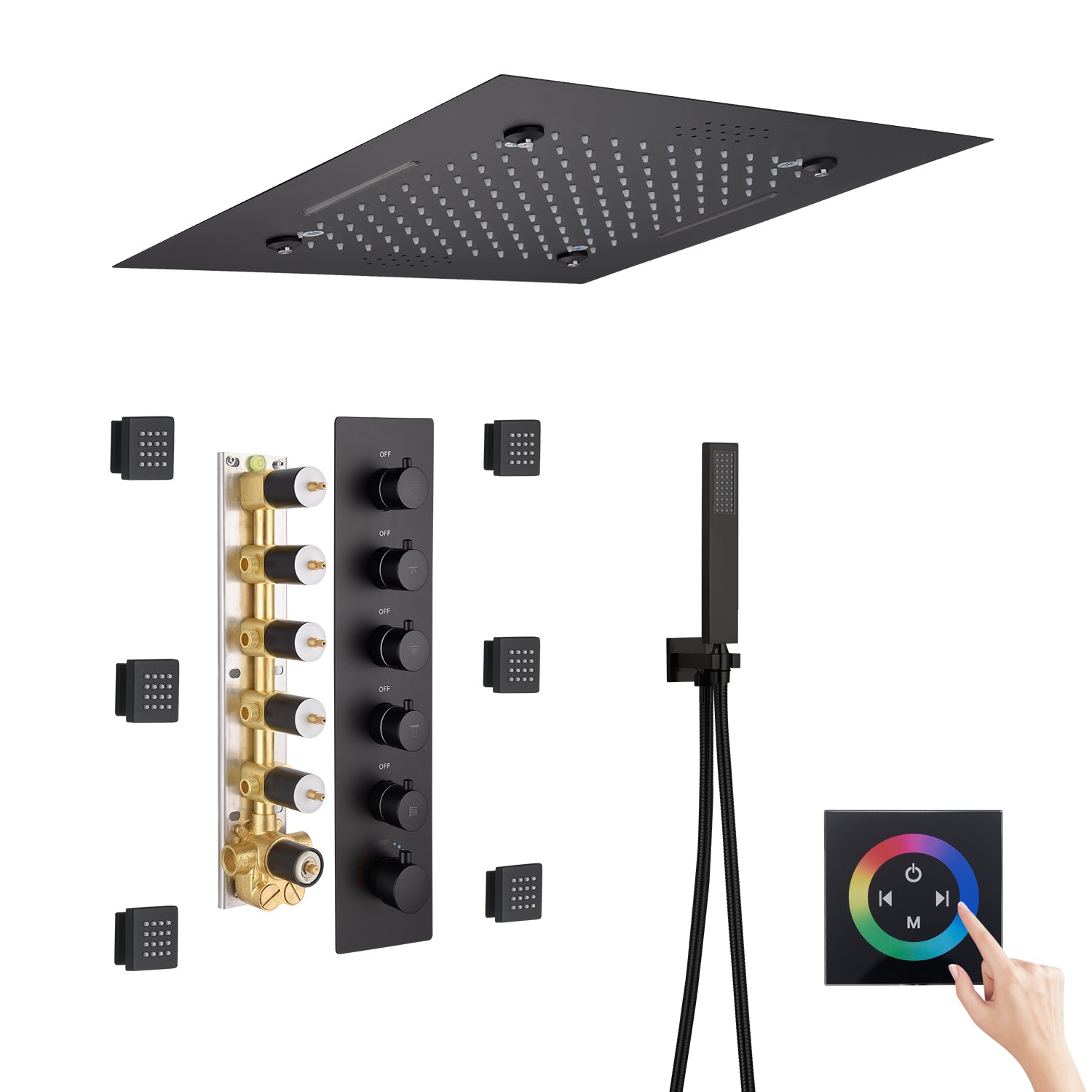 Matte Black 20 Inch Flushed Ceiling Mount Rainfall Waterfall Mist 64 LED Light Bluetooth Music Shower Head 5 Way Thermostatic Shower Faucet Set with Body Jets and Touch Panel