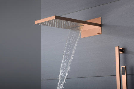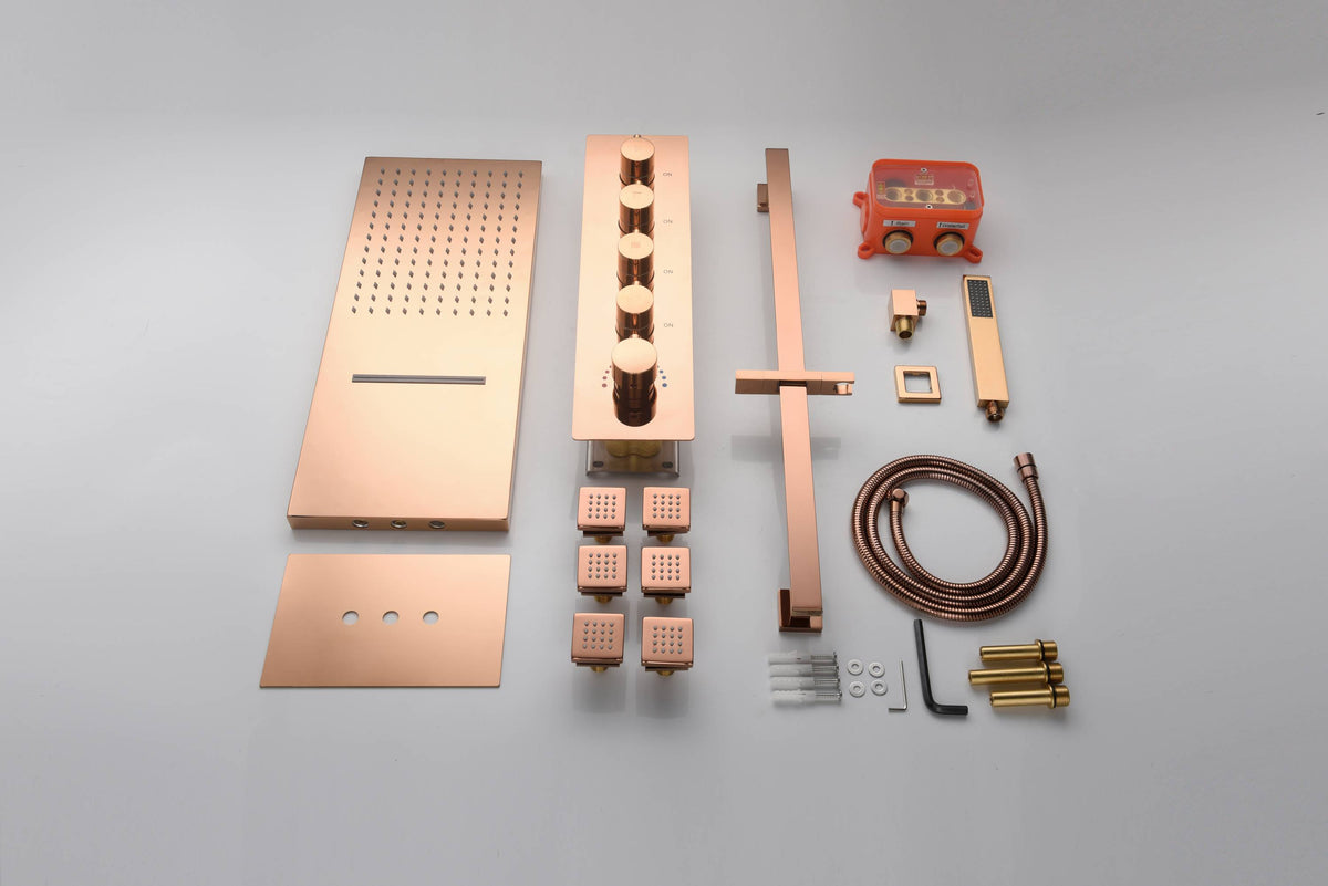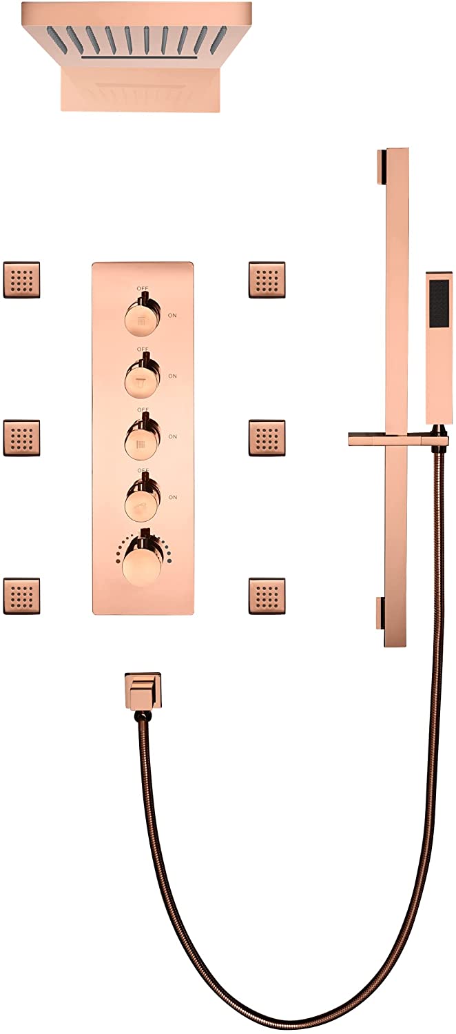 Rose Gold 22 Inch Rainfall Waterfall Shower Head 4 Way Thermostatic Shower Faucet Set with Slide Bar and Body Jets Each Function Work All Together and Separately