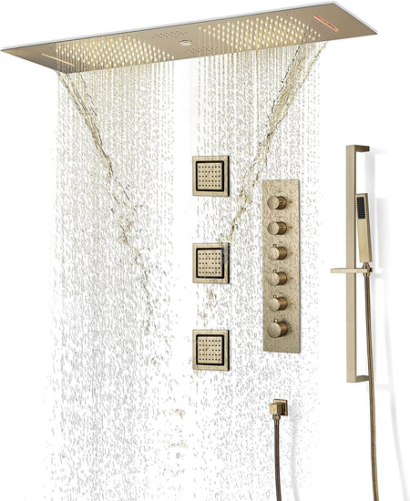 Brushed Gold 36 Inch Flushed Ceiling Mount Rainfall Waterfall Water Column 64 LED Light Bluetooth Music Shower Head 5 Way Thermostatic Shower Faucet Set with Body Jets and Touch Panel