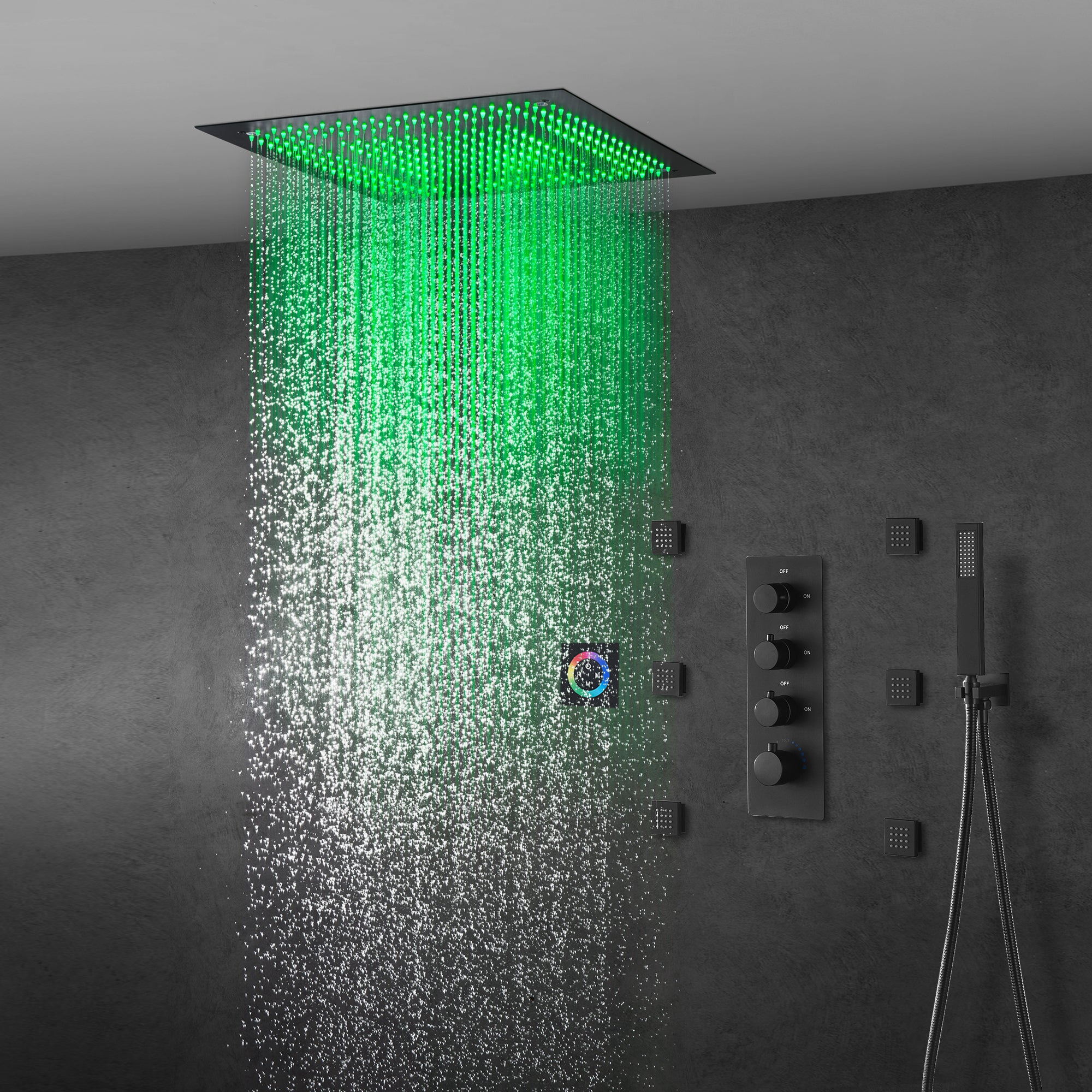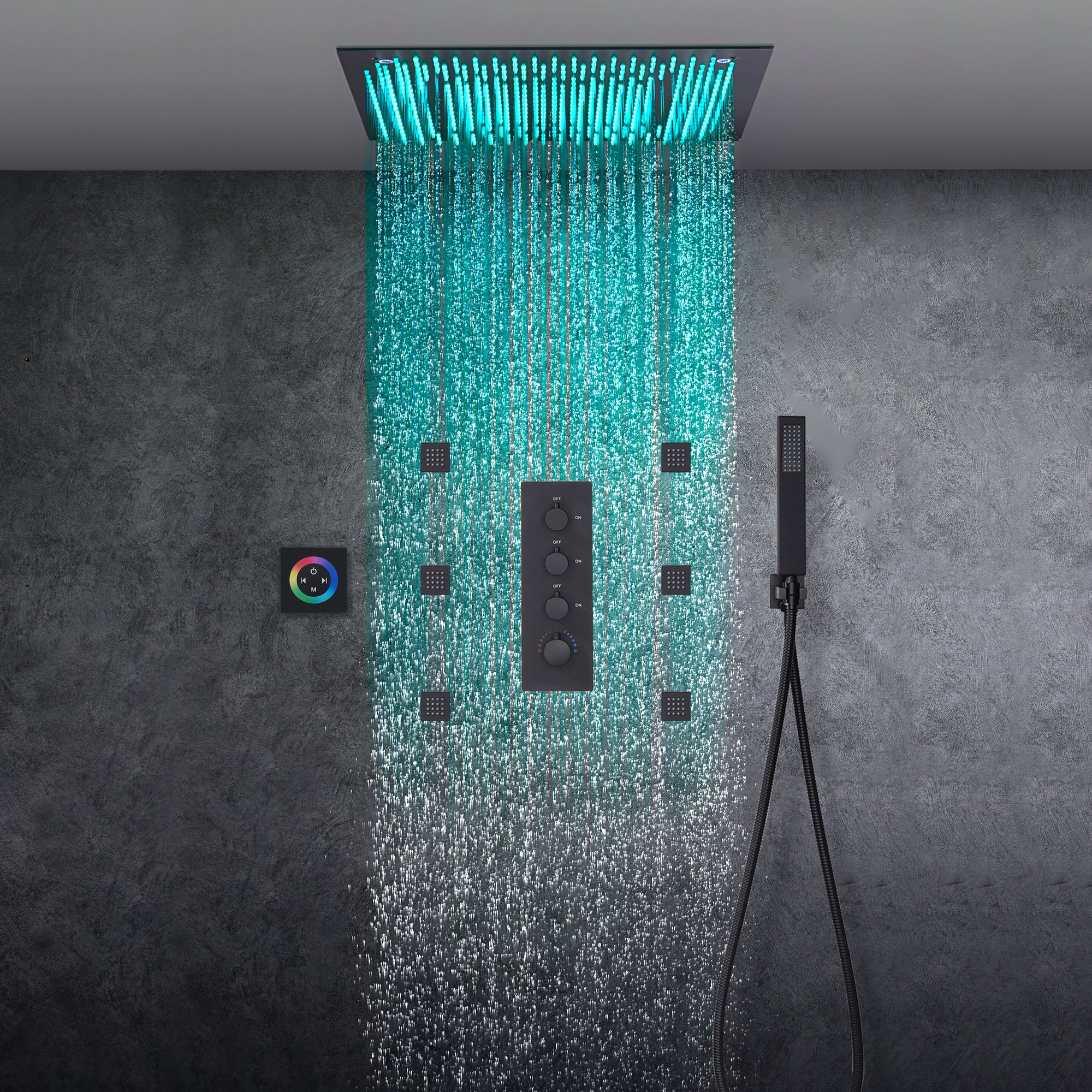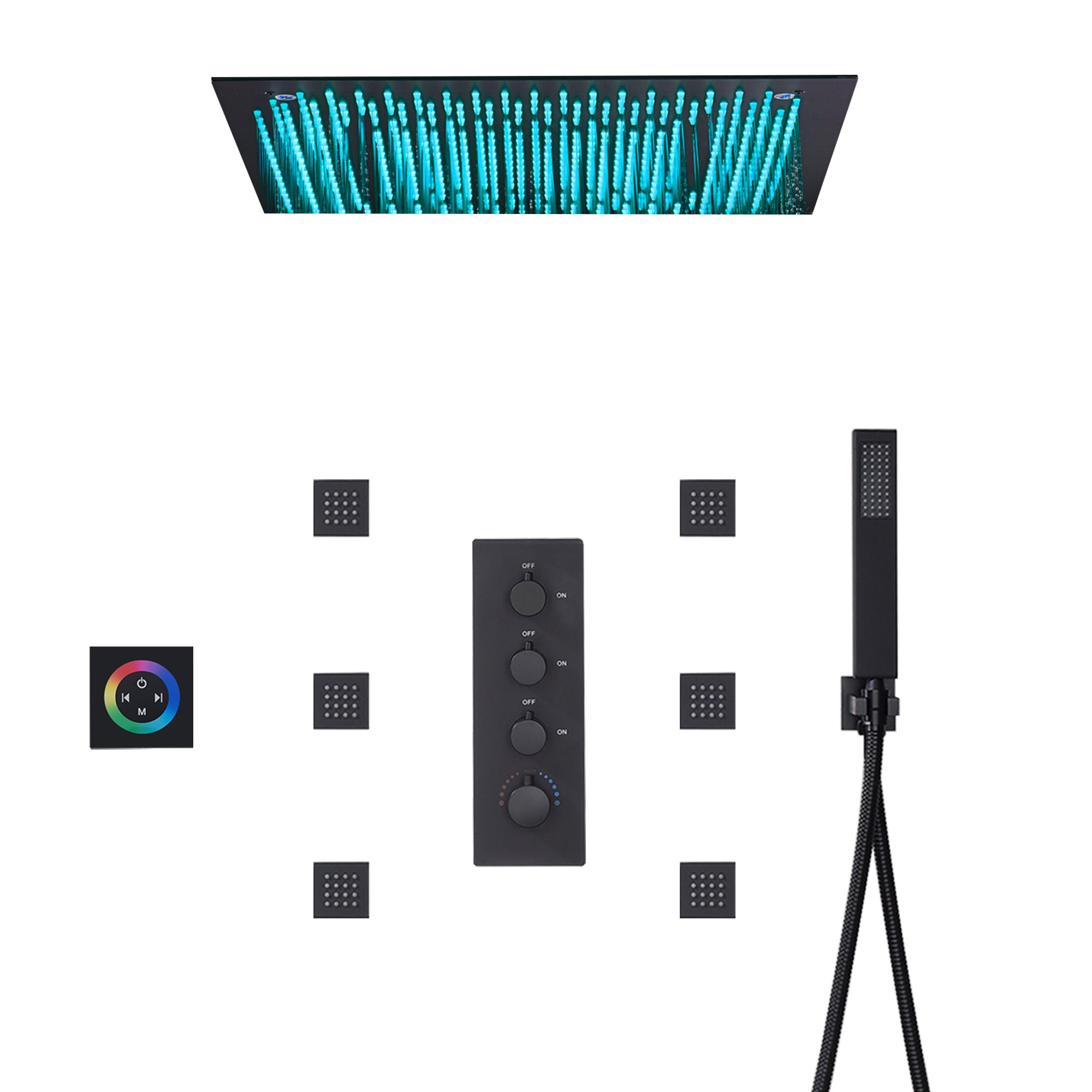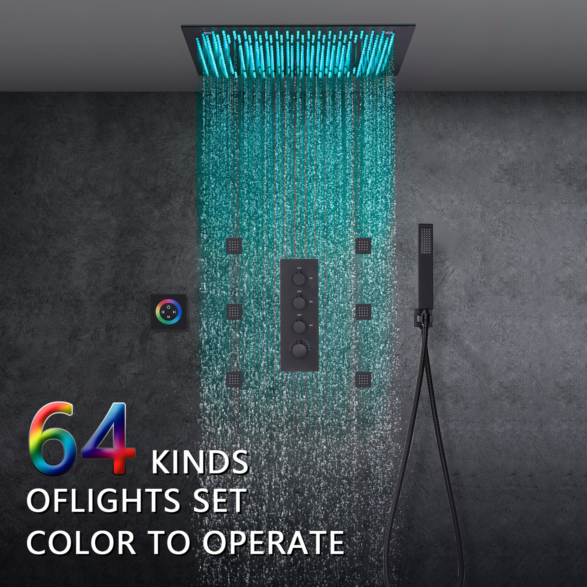 64 LED colors 20 inch Matte Black flushed on rainfall shower systems 3 way Digital display thermostatic shower faucet with 6 body jets and touch panel