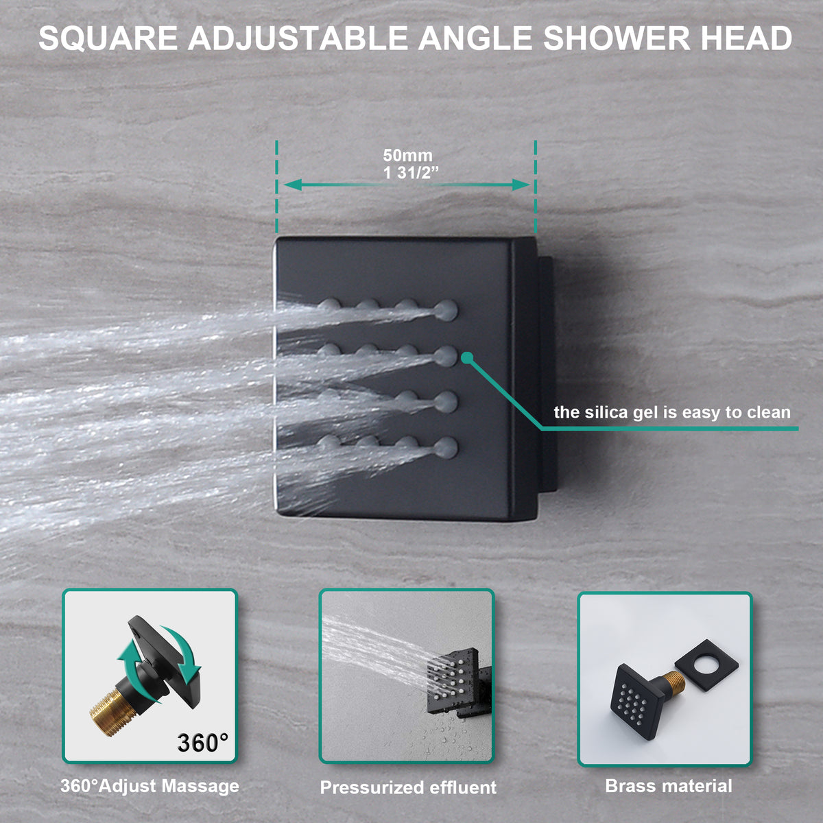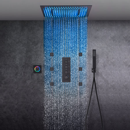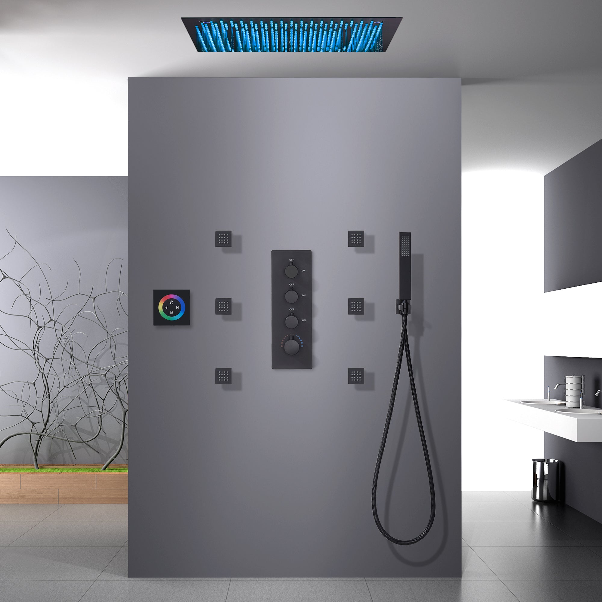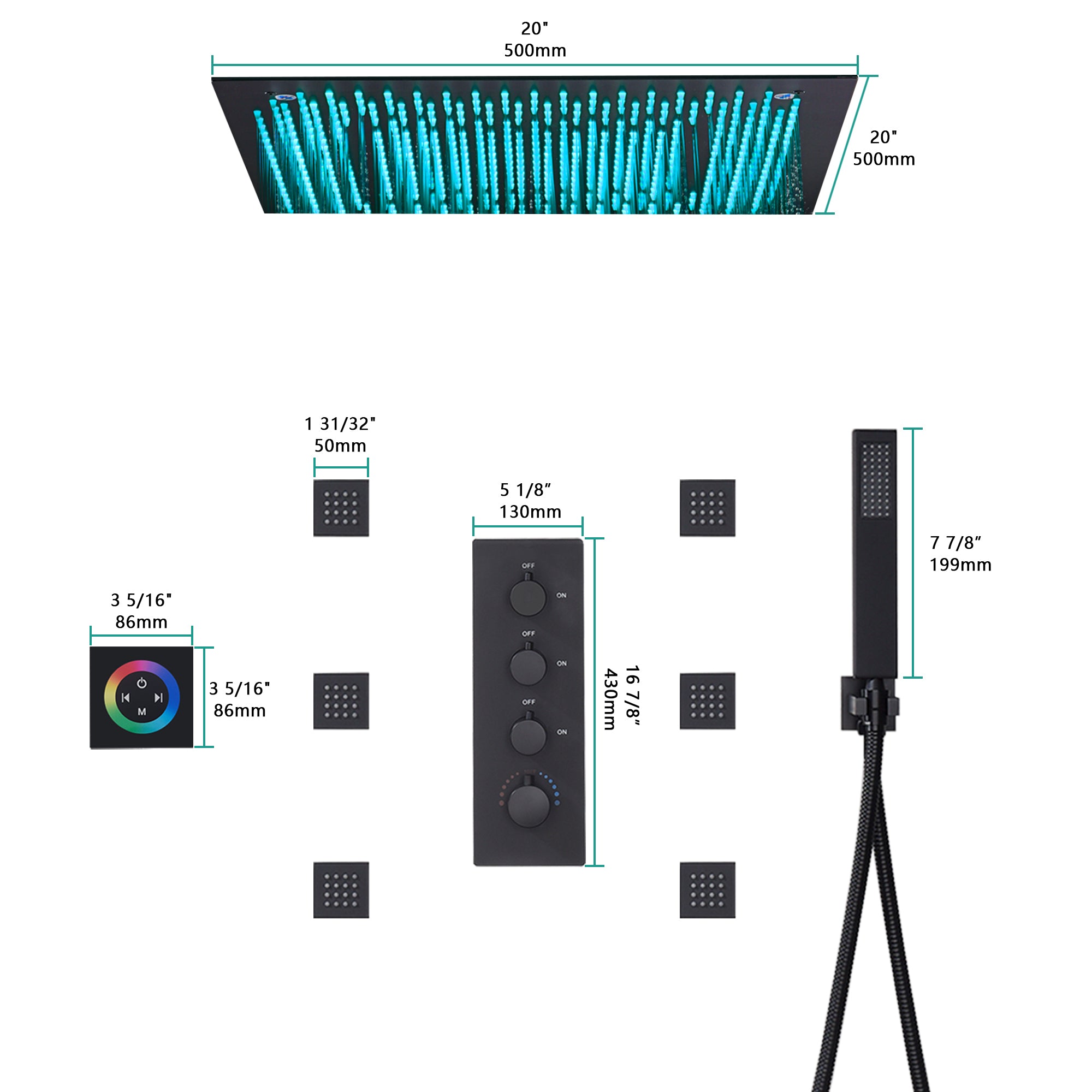 64 LED colors 20 inch Matte Black flushed on rainfall shower systems 3 way Digital display thermostatic shower faucet with 6 body jets and touch panel