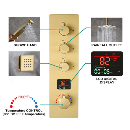 Brushed gold 3 way Thermostatic Shower jets system that each function run all together and separately