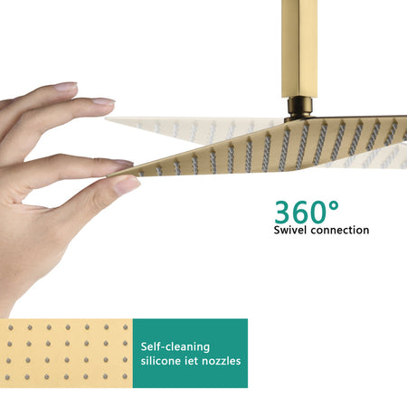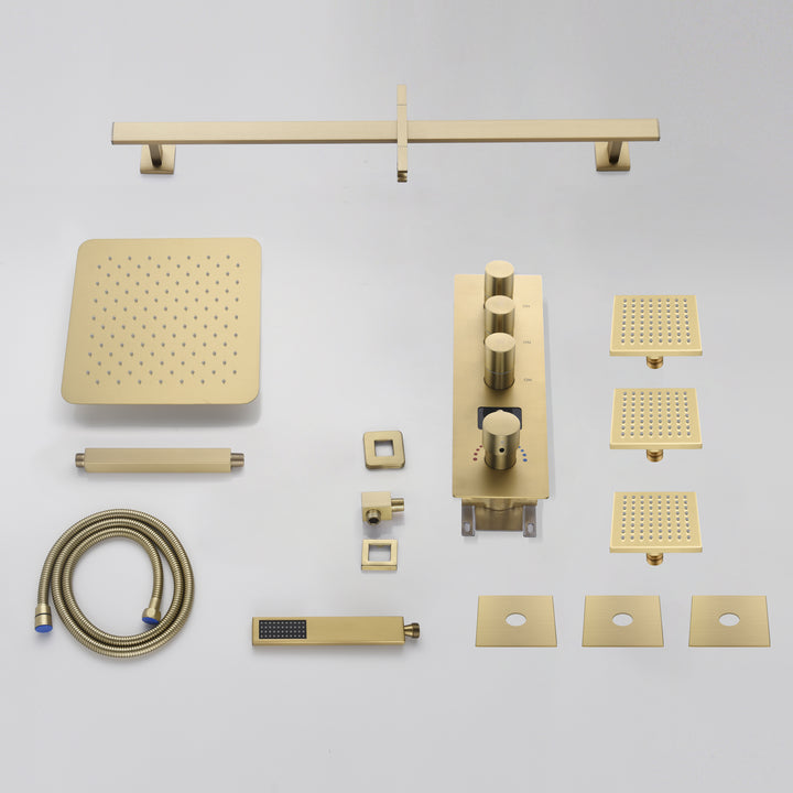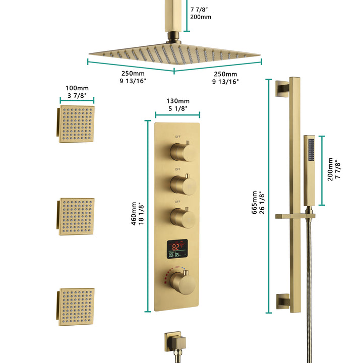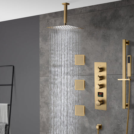Brushed gold ceiling mount 12 inch or 16 inch rain head 3 way digital display thermostatic shower faucet with large body sprayers