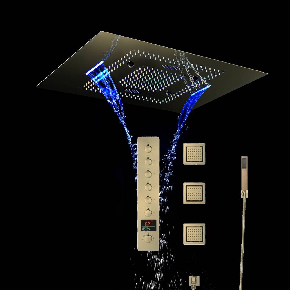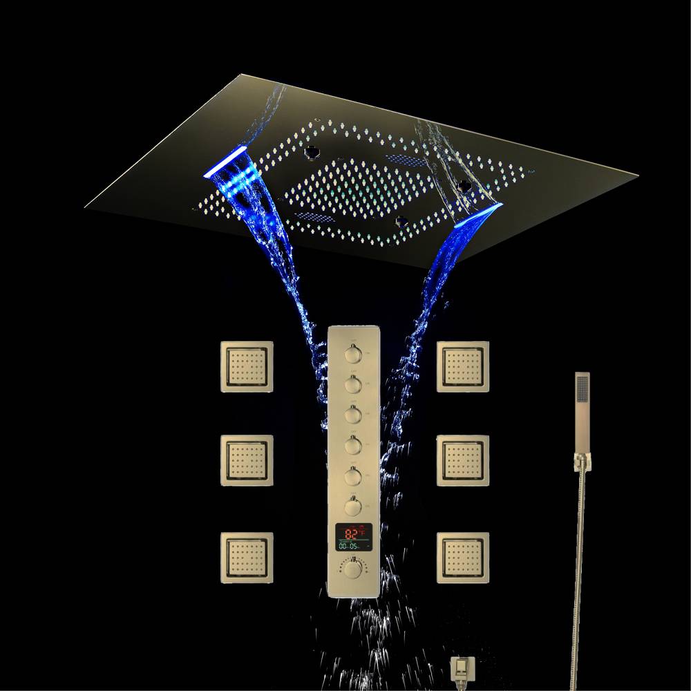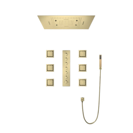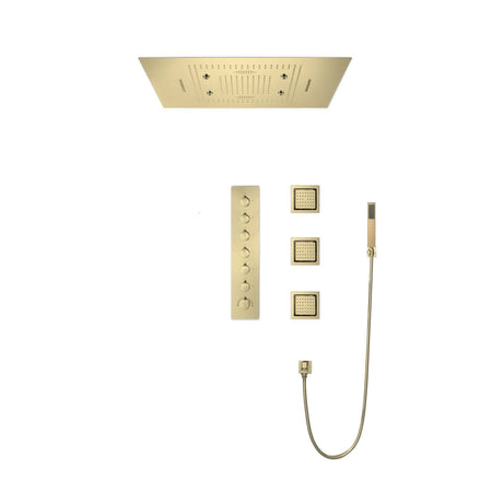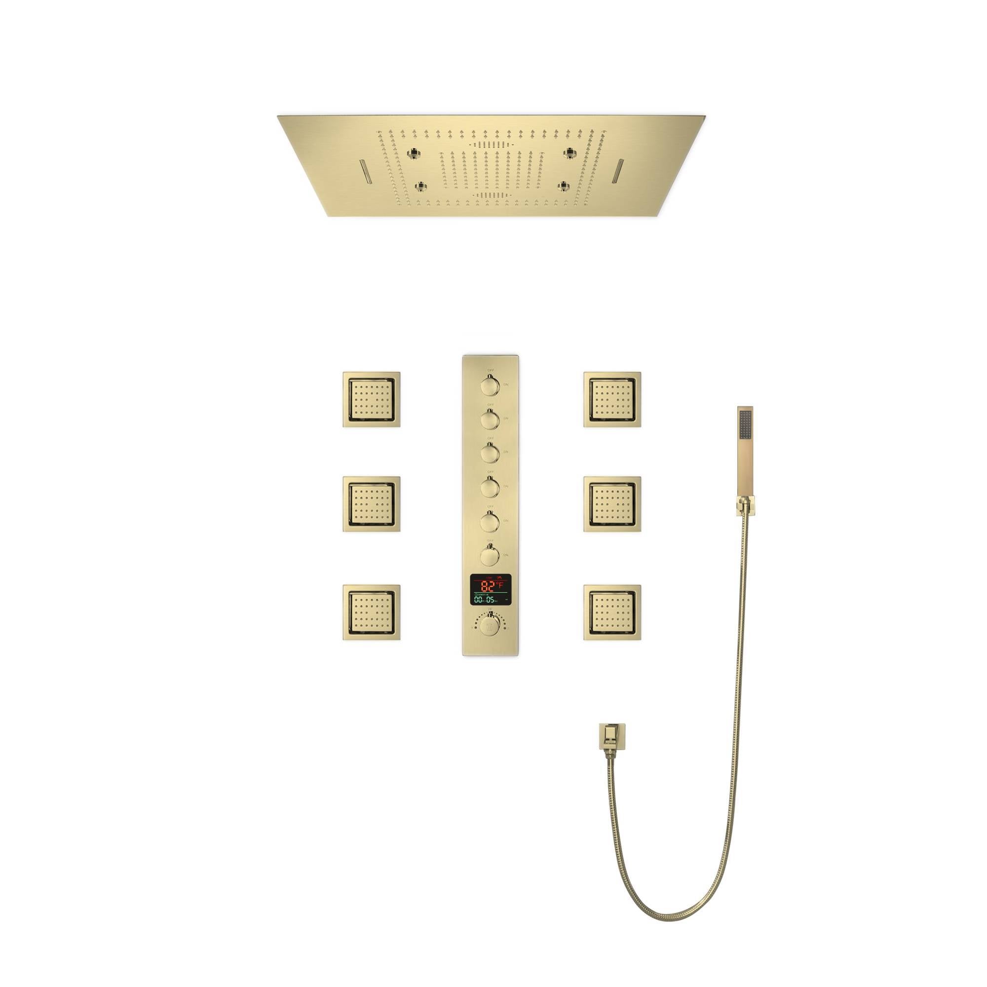 Brushed Gold Music LED Flushed in 31inch shower head 6 way thermostatic valve that each function run all together and separately