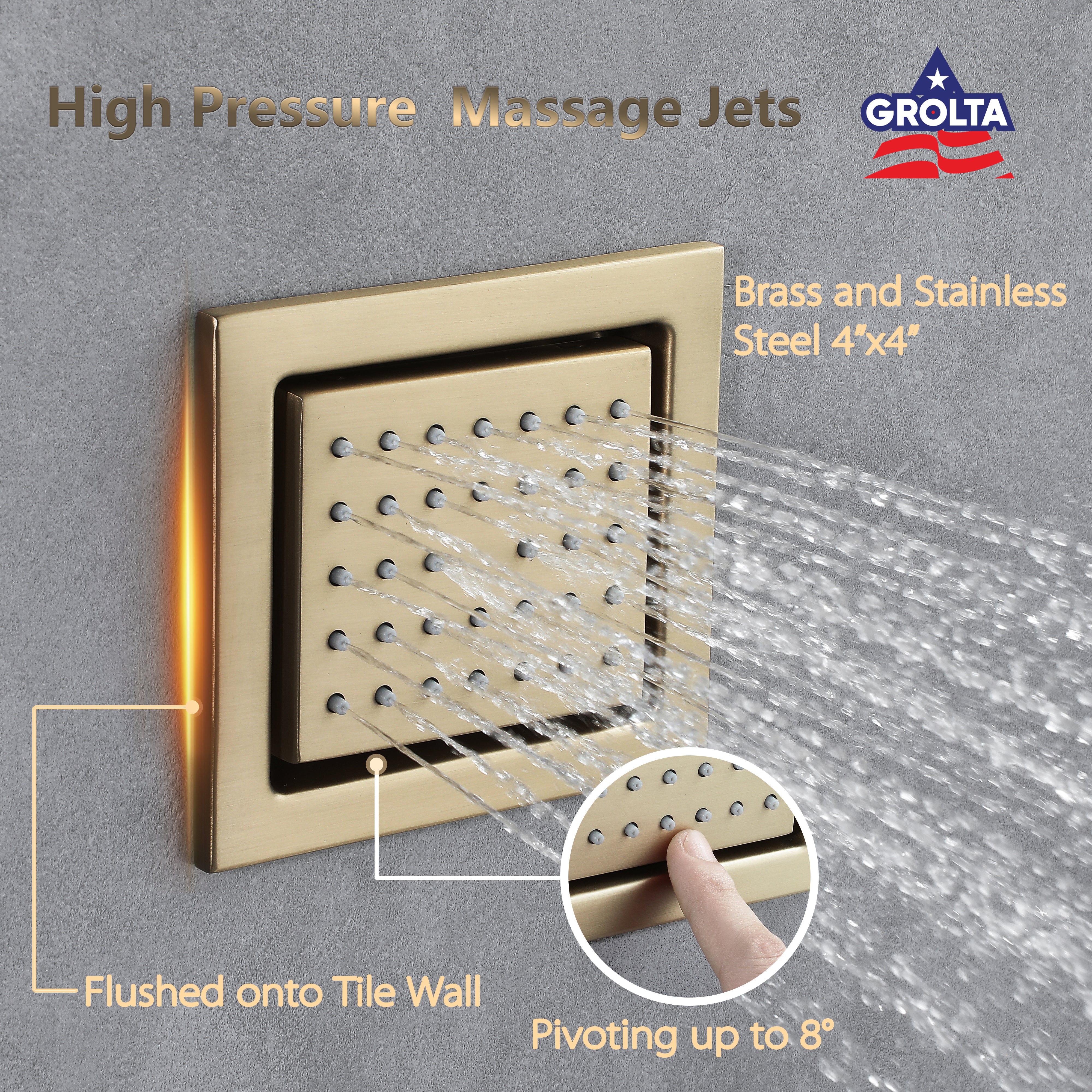 Body jets: flush in 4x4inch ( all body jets had better be installed in the same wall side so that it will get enought strong water pressure. if body jets are required to be installed in the opposite wall side, pls choose 2x2 inch body jets )