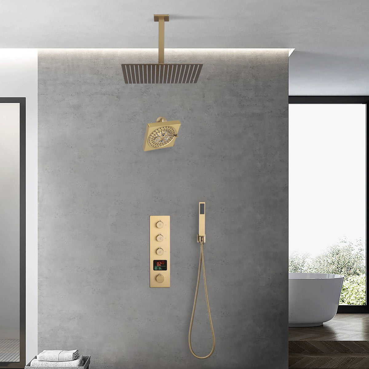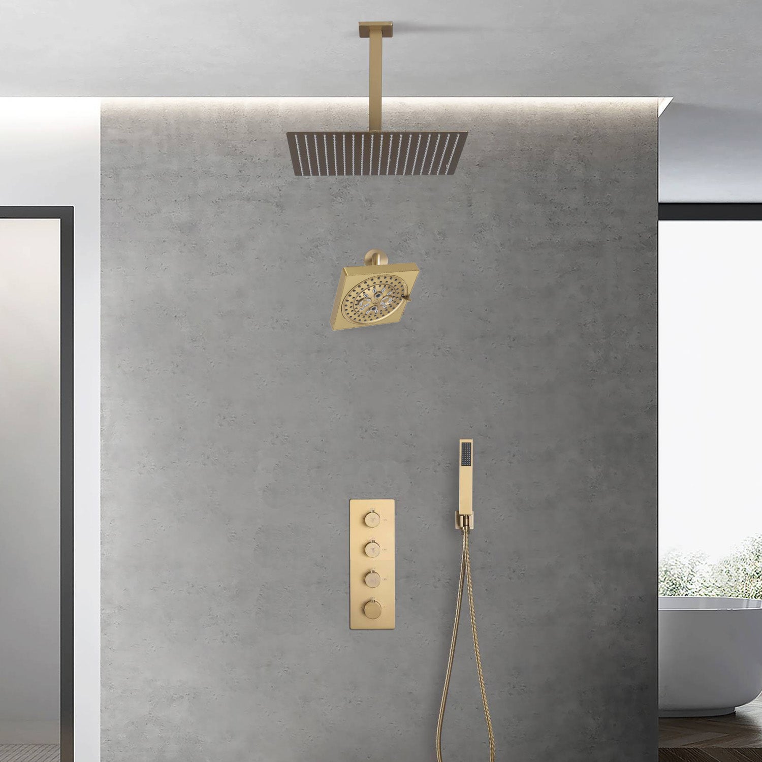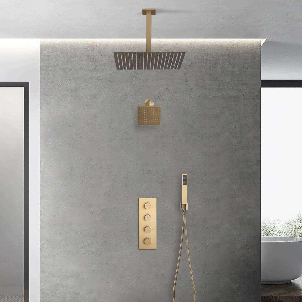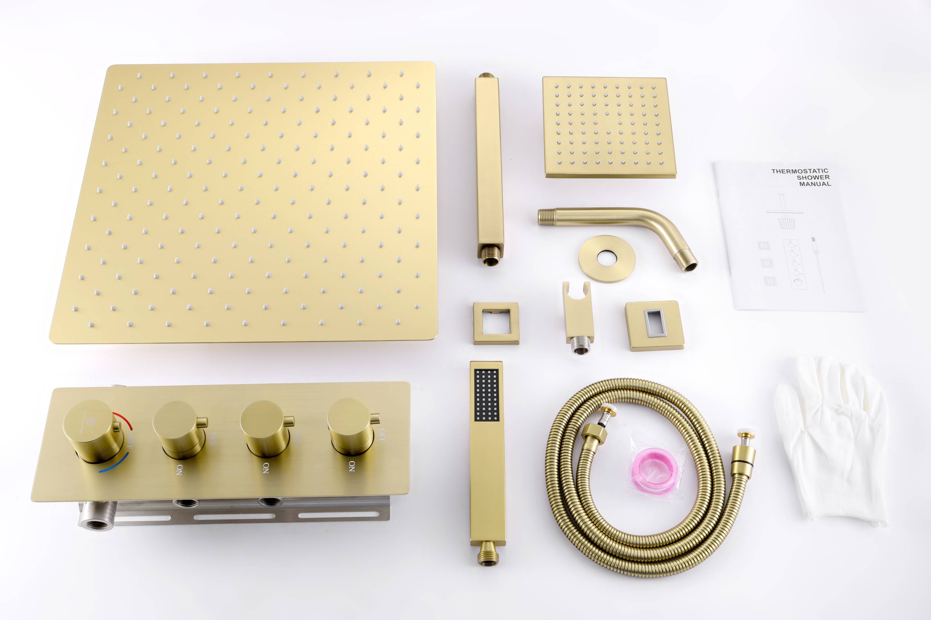 Brushed Gold rainfall shower head high pressure shower head 3 way thermostatic valve shower heads systems each function work at the same time and separately