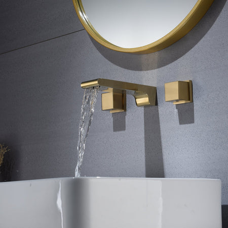 Brushed Gold waterfall Wall mount 3 holes two handles bathroom sink faucet with brass pop up overflow drain