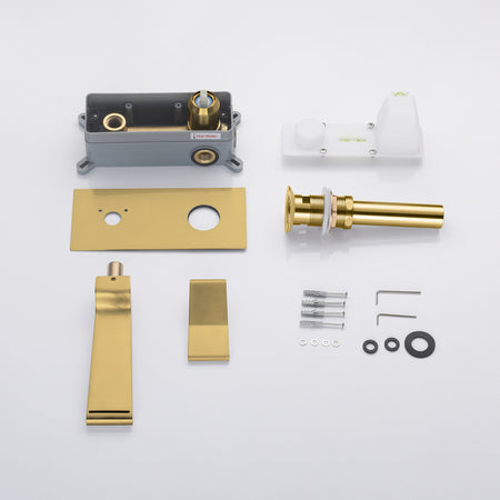 Brushed Gold waterfall Wall mount single handles bathroom sink faucet with brass pop up overflow drain
