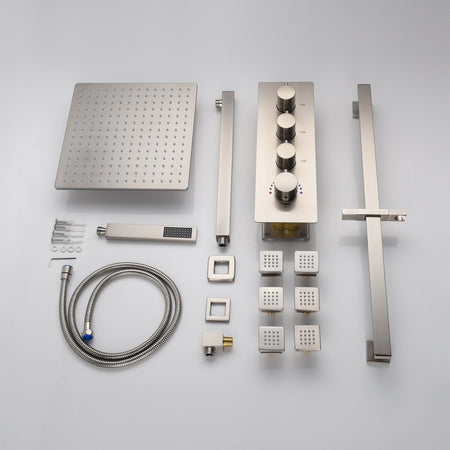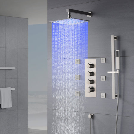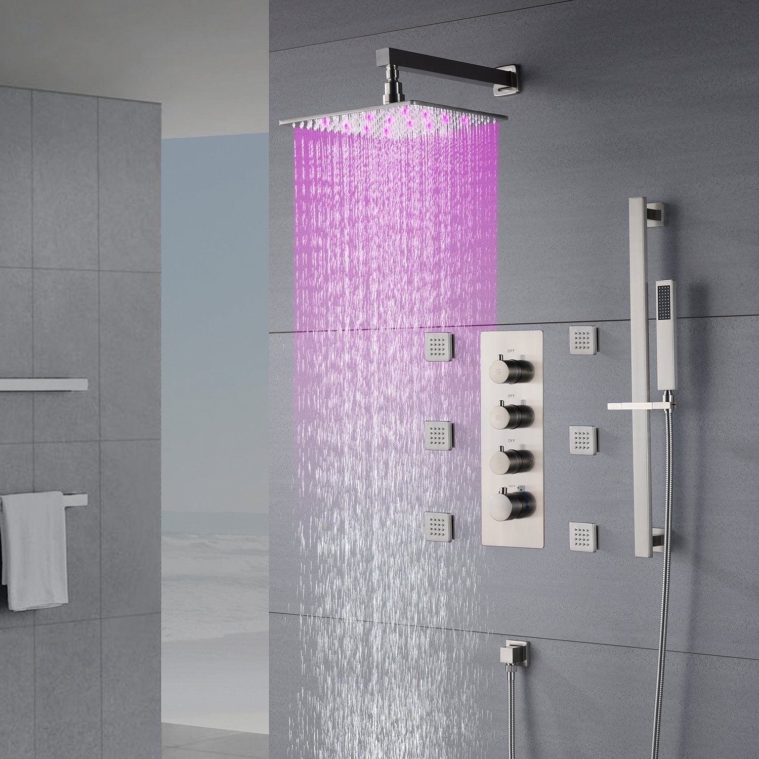 Brushed nickel 12 inch or 16 inch LED wall mount Rain Shower system with 6 body jets and 3 way Thermostatic valve that each function work all together and separately