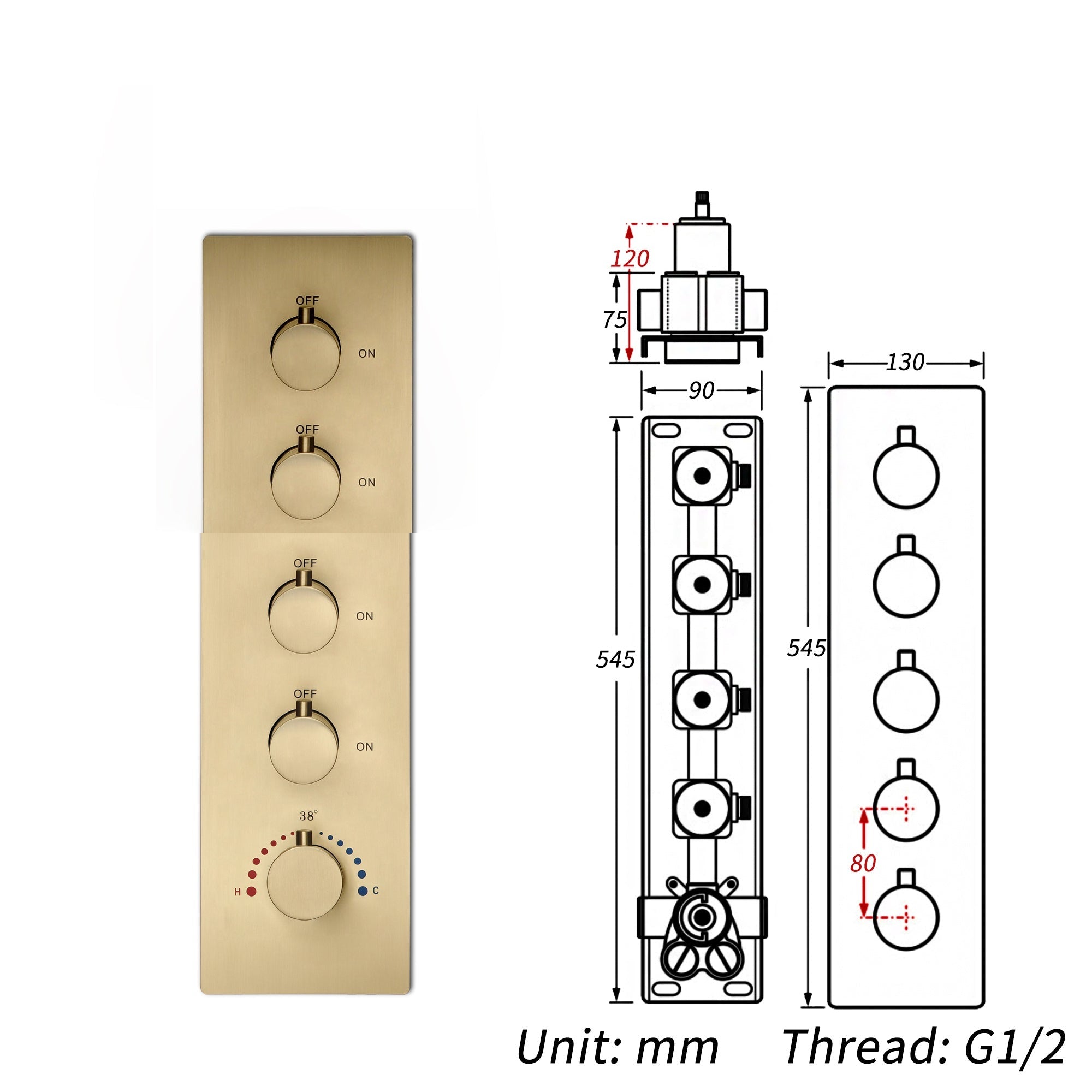 ceiling mounted rain shower 4 way Brushed Gold thermostatic shower system with 6 body jets and wall mount rain shower