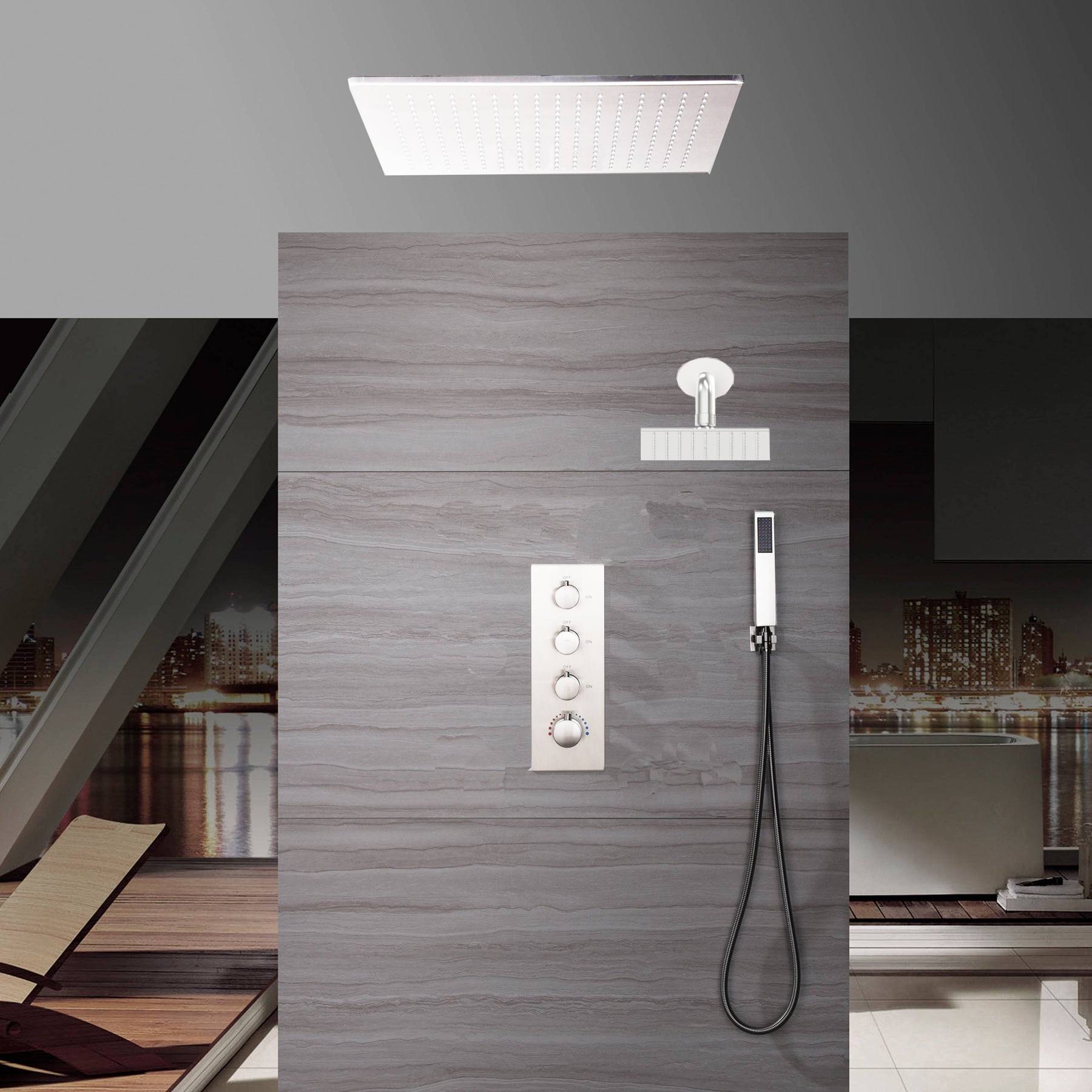 Chrome ceiling mount 20 inch or 24 inch rainfall shower head system 3 way thermostatic shower faucet with wall mount 6 inch high water pressure regular shower head