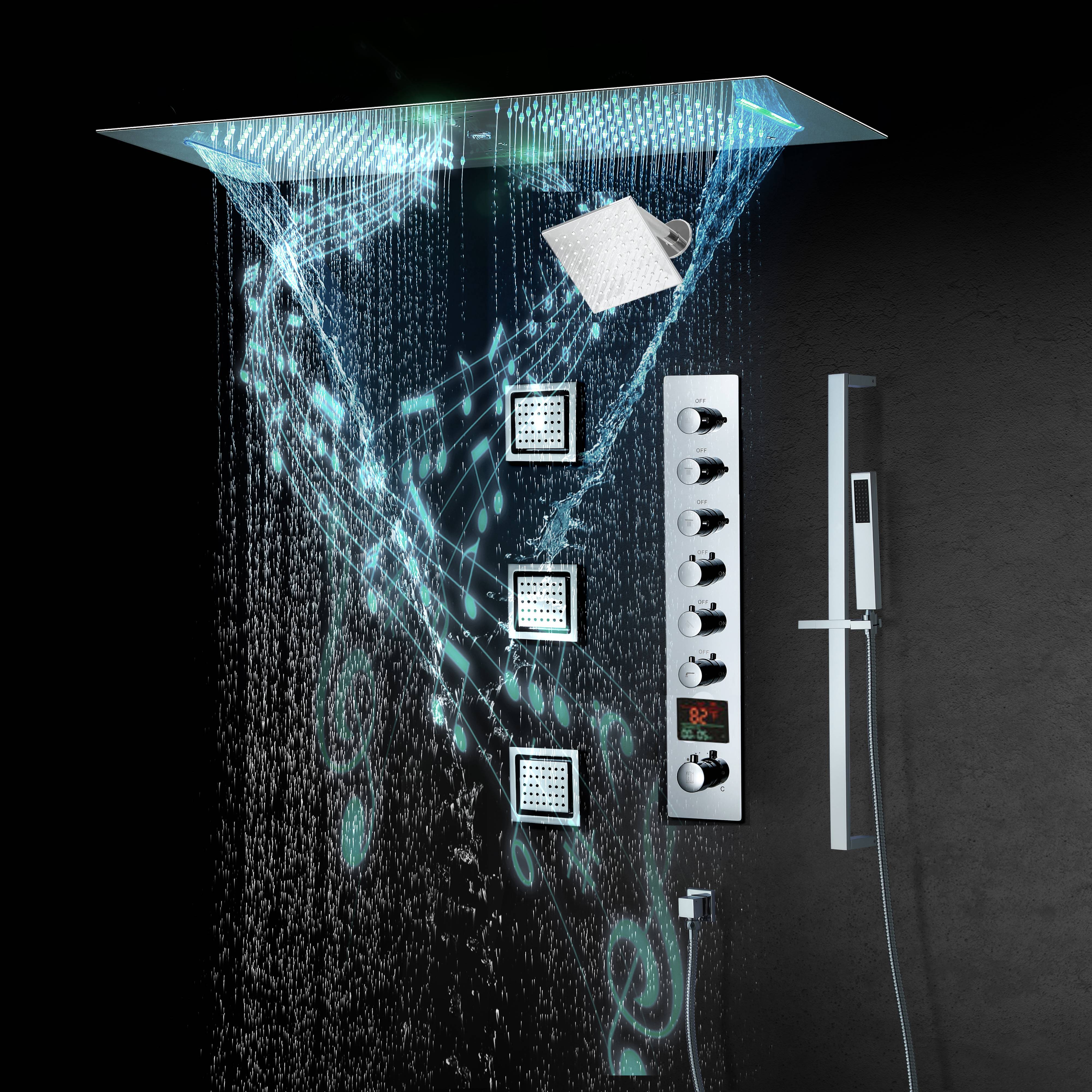 Bluetooth Music Shower System features a top enjoyment of showering time with music, 64 color LED lights, water massage, rain shower, waterfall shower, water columnand handheld spray. Each function work independently, so you can either let all functions work at the same time or only turn one or some of them.