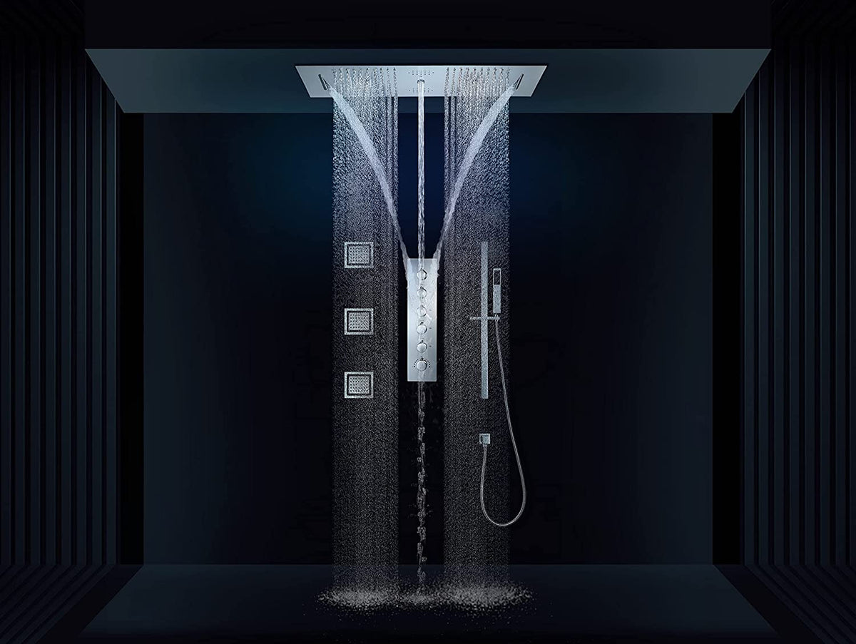 Chrome 36 Inch Flushed Ceiling Mount Rainfall Waterfall Water Column 64 LED Light Bluetooth Music Shower Head 6 Way Thermostatic Shower Faucet Set with regular head, Body Jets and Touch Panel