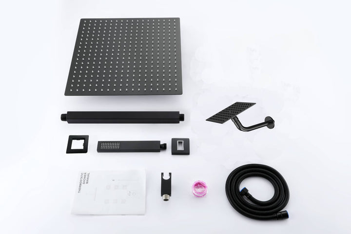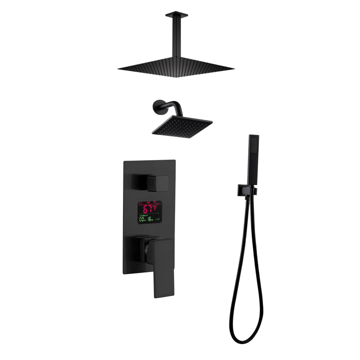 matte black ceiling mount 12 inch or 16 inch rainfall shower head 3 way digital regular rough in valve shower system with wall mount 6 inch high water pressure brass shower head