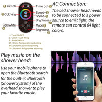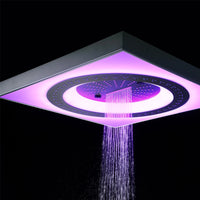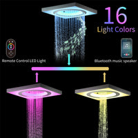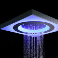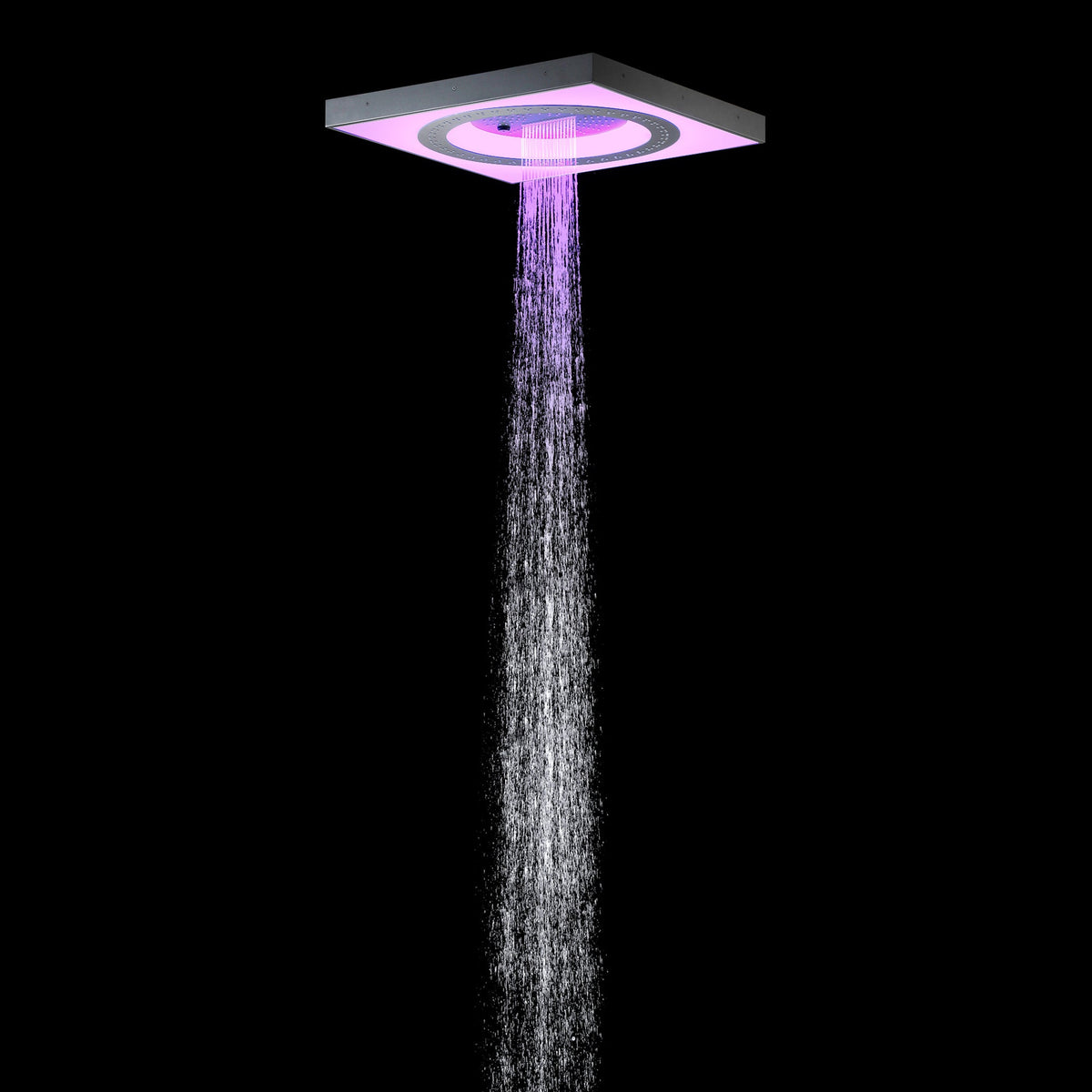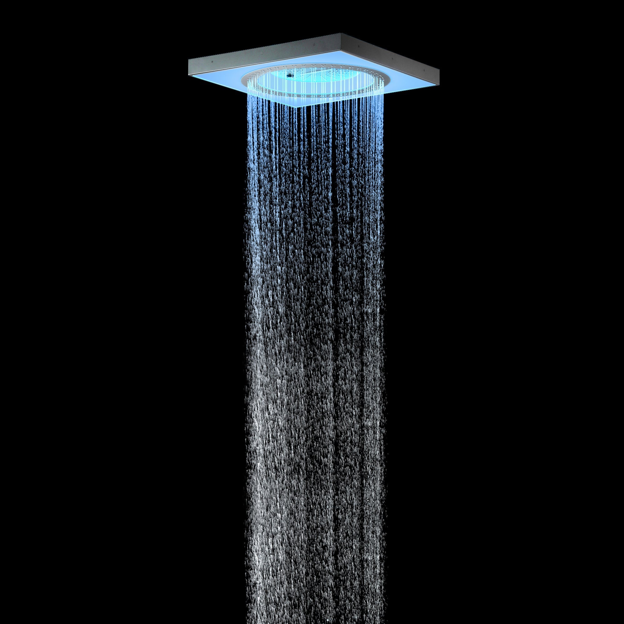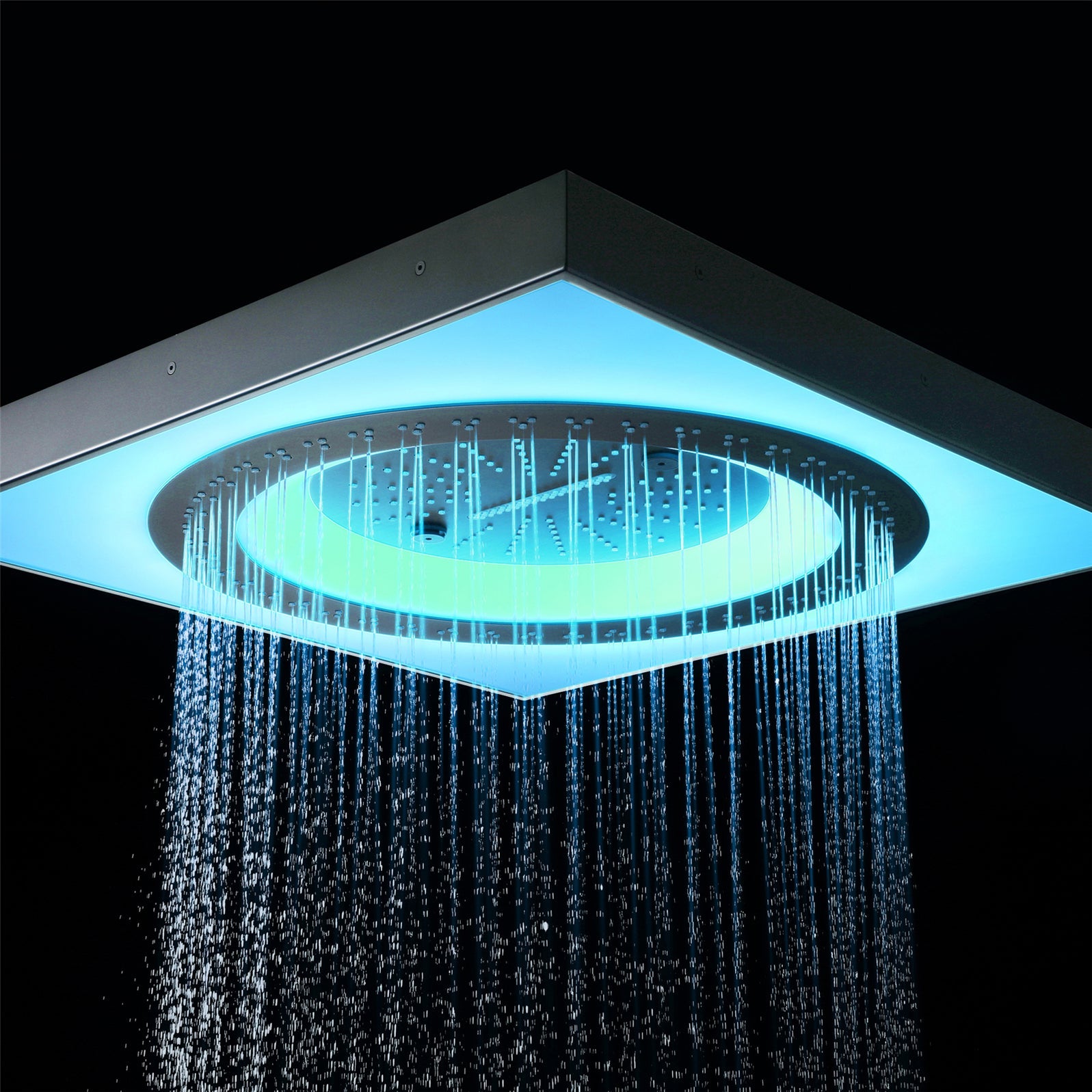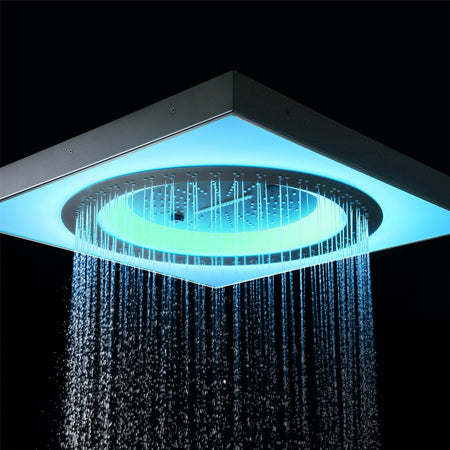 The system includes a large 24 x 24 inch rainfall shower head, complete with 16 LED lights that can be controlled by a remote panel. You can turn the lights on or off as you shower, personalizing your experience. The LED lights are powered electronically and offer manual operation, allowing you to select from 16 different colors. It has two separate rainfall feature plus one waterfall feature.