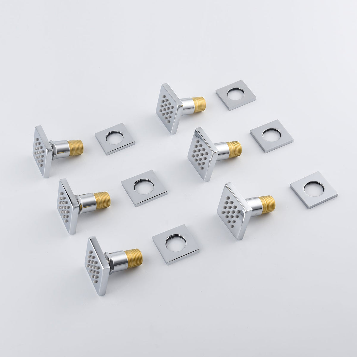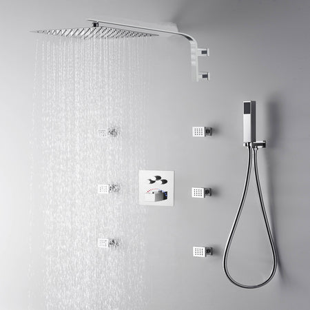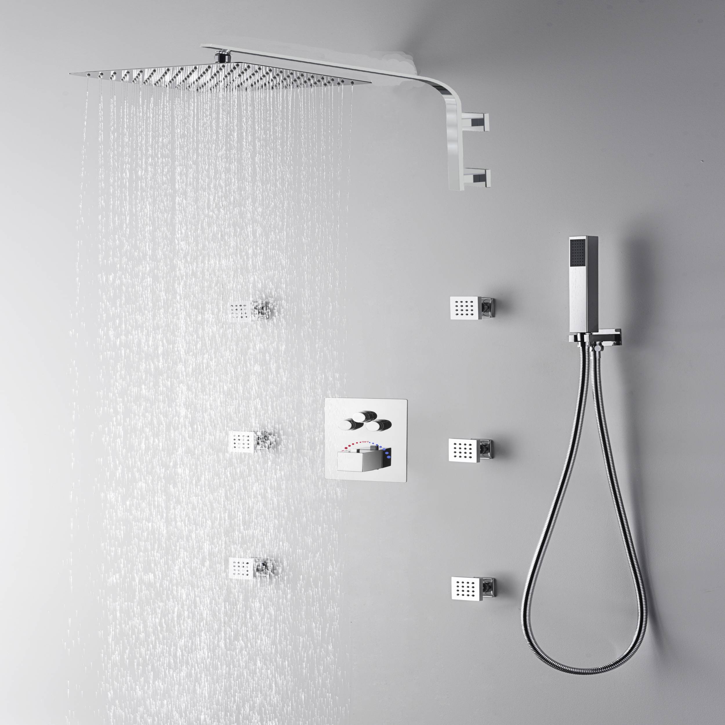 22 inch wall mount shower arm 12 inch or 16 inch 3 LED light Chrome 3 way Thermostaic Shower valve systems with 6 body jets that each function run All together and separately